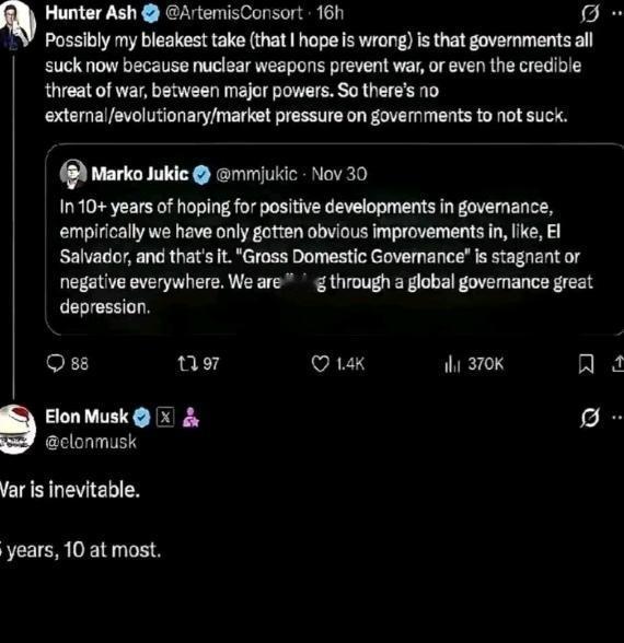 马斯克凌晨3点不睡觉,直接给全世界泼了一盆凉水。他在网上断言:战争无法避免,就在未来5到10年。 2025年12月1日,X平台上正讨论核威慑如何影响政府治理。一位用户指出,核武器存在让大国间缺少直接对抗压力,导致治理水平停滞。马斯克直接回复,内容只有两句:战争不可避免,五年,最多十年。这条帖子没有解释具体冲突方,也没有列出原因,仅以断言形式出现。发布后迅速传播,浏览量短时内超过数百万,相关话题登上趋势榜。 这条声明引发广泛关注,多家国际媒体次日报道,标题多强调“不可避免”和时间窗口。印度NDTV、印度今日、印度时报等机构均引用原帖,指出马斯克未提供细节。用户转向xAI的Grok助手查询,Grok汇总马斯克以往言论,提到可能关联欧洲移民压力、身份政治分裂、乌克兰冲突升级、台湾问题引发中美对抗等,但强调这些非本次直接说明。 马斯克过去曾多次评论全球稳定。2024年英国反移民骚乱期间,他称内战不可避免,引发英国政府回应。此次声明延续类似风格,却更直接指向大国层面。专家观点分歧,一些承认地缘热点增多,但认为核威慑仍抑制大规模战争;另一些质疑时间预测依据。整体讨论保持在舆论层面,无官方外交反应。 事件背景源于核威慑理论讨论。原帖认为缺少外部威胁让政府缺少改进动力,马斯克回复挑战这一观点,暗示紧张积累将突破威慑。帖子发布时间为美国当地凌晨,符合马斯克习惯。传播中,用户分成几派,一部分表达担忧,一部分要求证据,还有人联想到马斯克商业利益,如SpaceX军方合同。 几天后,辩论热度不减。平台上用户分析核历史案例,列出潜在风险点,包括欧洲内部矛盾和大国竞争。媒体报道持续,从亚洲到欧美多家机构采访专家,观点多认可风险上升但时间不确定。马斯克未追加评论,继续公司事务。 事件逐步淡出头条,从趋势榜降为常规话题。声明作为平台记录存在,未改变国际格局。全球局势维持复杂平衡,无即时大规模对抗。马斯克保持活跃,专注科技项目,那条预测成为其众多言论之一。 马斯克的断言虽简短,却触及核心问题:核时代下,和平是否永久?当前世界面临多重挑战,美国国债规模巨大,利息支出已超部分军费。全球人口结构变化,东亚多国生育率低,影响长期动员能力。技术进步让冲突形式演变,无人机等低成本武器降低门槛。 这些因素交织,让大国博弈更复杂。乌克兰冲突已展示无人机作用,改变传统战争成本计算。台湾海峡、南海等地缘热点持续受关注,供应链依赖加剧摩擦。马斯克未明说具体区域,但其以往表述常涉及这些。 避免冲突需各国加强危机管控。贸易互联、相互投资形成制约,核威慑仍是大国底线。未来几年,外交对话和经济合作至关重要。技术发展双刃剑,既可降低烈度,也可能放大风险。 马斯克此言提醒人们留意国际动态。和平来之不易,需各方努力维护。无论预测准与否,都值得思考如何在紧张中寻求稳定。