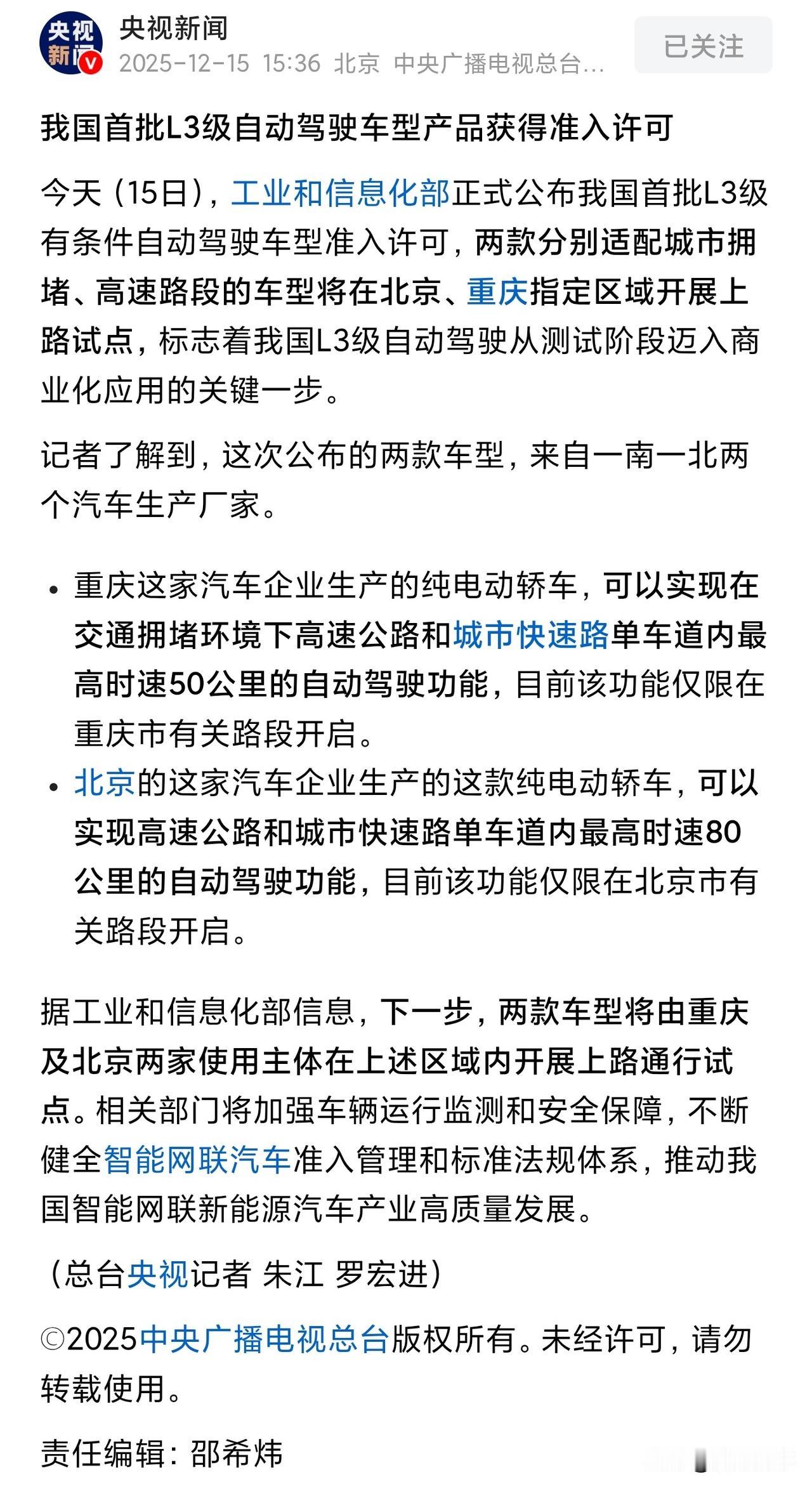 央视新闻频道专门就L3级自动驾驶出了一期节目,今天(15日)工信部正式公布我国首批L3级有条件自动驾驶车型准入许可,有两款分别适配城市拥堵、高速路段的车型将在一北(北京)、一南(重庆)制定区域开展上路试点,据记者了解到,这两款车型,分别是来自一南一北两个汽车生产厂家。 大家都在猜测,这两家车企分别是哪两家呢?肯定有很多人猜测肯定是搭载了华为乾崑智驾ADS吧,因为华为的智驾目前在国内处于第一梯队水平,大家觉得除了华为的智驾可以首批获得准入许可,还有哪家智能可以入围呢?汽车自动驾驶 华为L3智驾 自动驾驶标准 自动驾驶新标准 智驾驾驶 智能驾驶新规 智能驾驶排名 自动驾驶平台