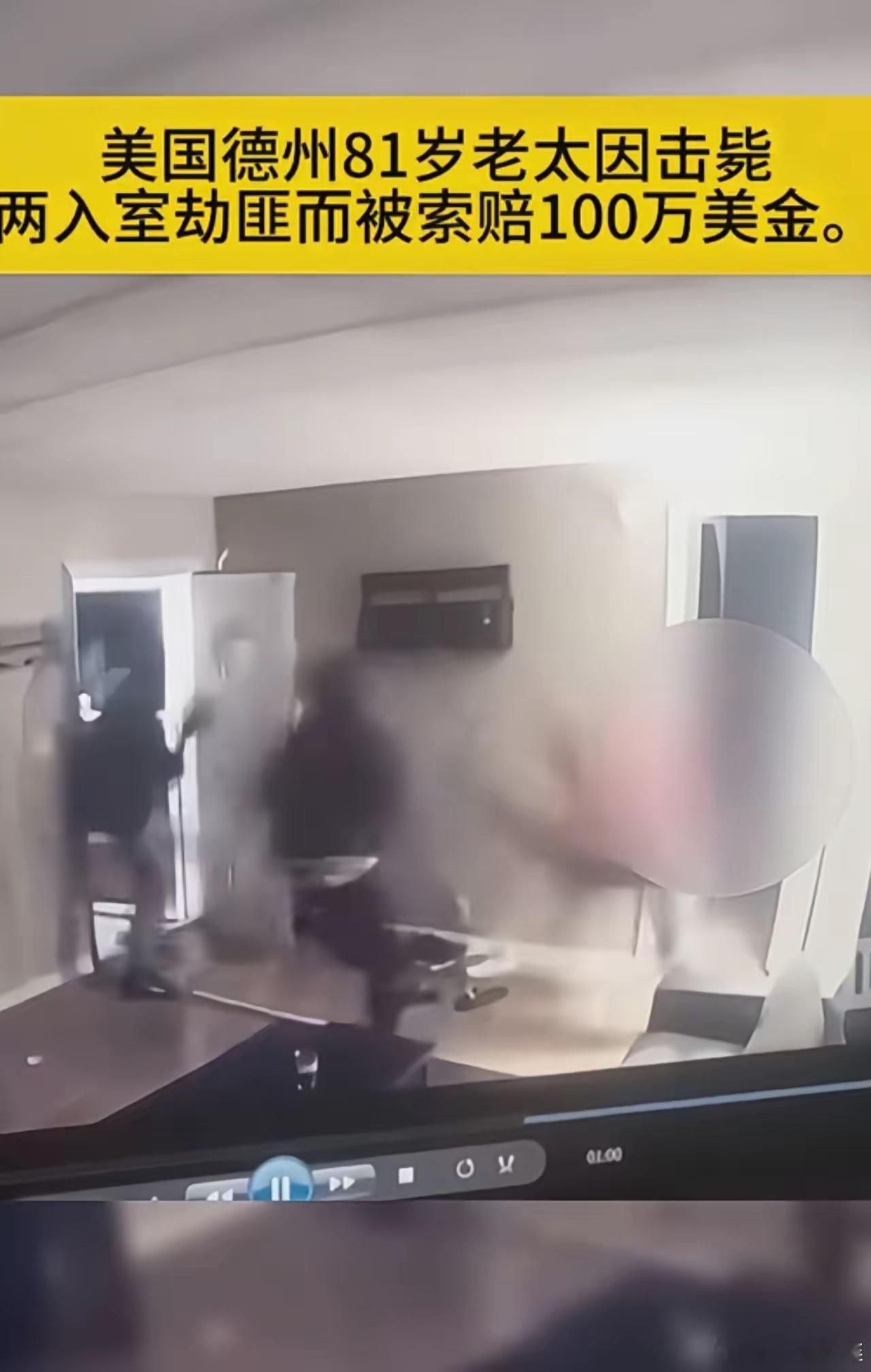 近日法庭上母亲哭诉并斥责老太太:“我的儿子只是想抢你点东西而已,如果你不反抗,他根本就不会死,你会为此付出更多的代价的。”法官被气炸了:“闭嘴!!!该付出代价的是你!”美国德州81岁老太因击毙入室劫匪而被索赔100万美金 !德克萨斯州两名15到16岁少年,入室抢劫,在他们破门而入的瞬间,激发起81老太太的反抗,随手拿起猎枪就射,当场击毙一名少年,岁后出门追击打伤另一名少年,送医后抢救无效死亡。家属提出民事起诉,要求100万美元,但是被法官驳回,老太被按正当防卫宣判无罪。作为中国人,你能接受吗?