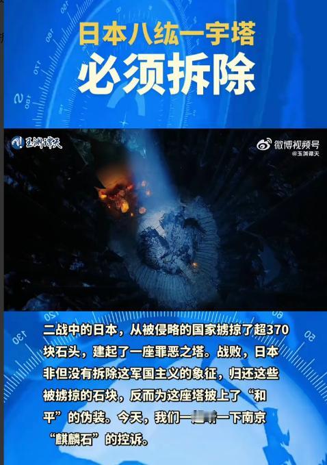 责令日本政府拆除“八纮一宇塔”,你支持吗? 把侵略抢到的受害国的东西,做成标志物炫耀,是往被侵略国的伤口上撒盐,是在隐藏继续侵略的野心! 这是日本侵略的铁证,必须拆除把石头送回原地,日本侵略者犯下的罪行世世代代不能忘记,落后就要挨打,愿中国早日强大,屹立世界之巅。 这座“妖塔”绝不能成为历史盲区!一定要让全世界看见:历史不容篡改,赃物必须归还,民族尊严寸步不让!幸甚!我中华儿女不忘国耻!发愤图强,扭转乾坤,强国强军,护我子民。勿忘血耻!