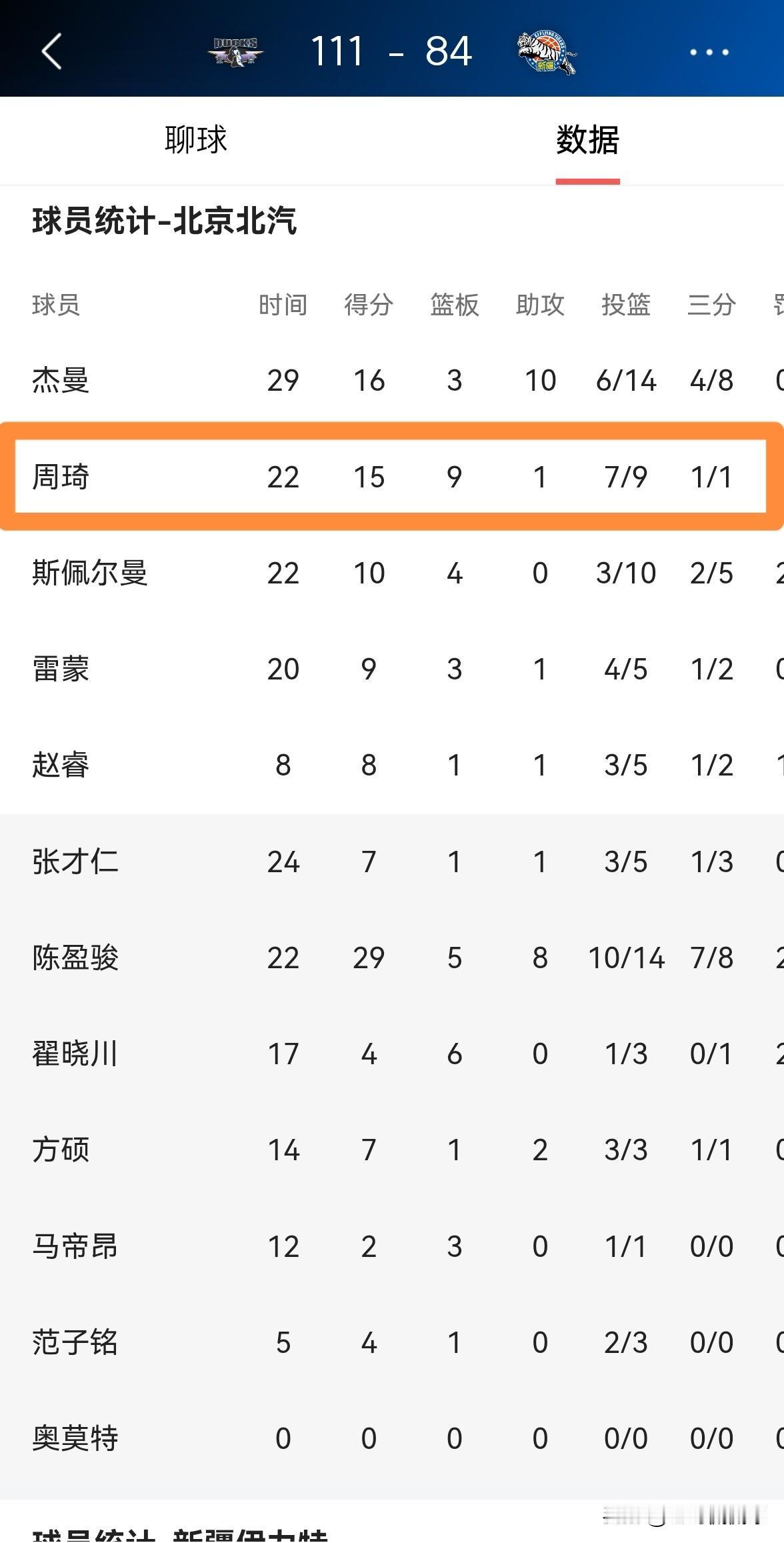 北京北汽当家中锋周琦真是予取予求!在今天北京北汽主场以111:84大胜新疆伊犁特的比赛中,周琦首发出战22分钟,投篮9中7,其中三分球1中1非常高效的砍下15分9篮板1抢断,他的场上正负值高达+35。 坦白说,本场比赛周琦在篮下真是游刃有余、予取予求,得分对于他这样的球员来说真是太轻松了。