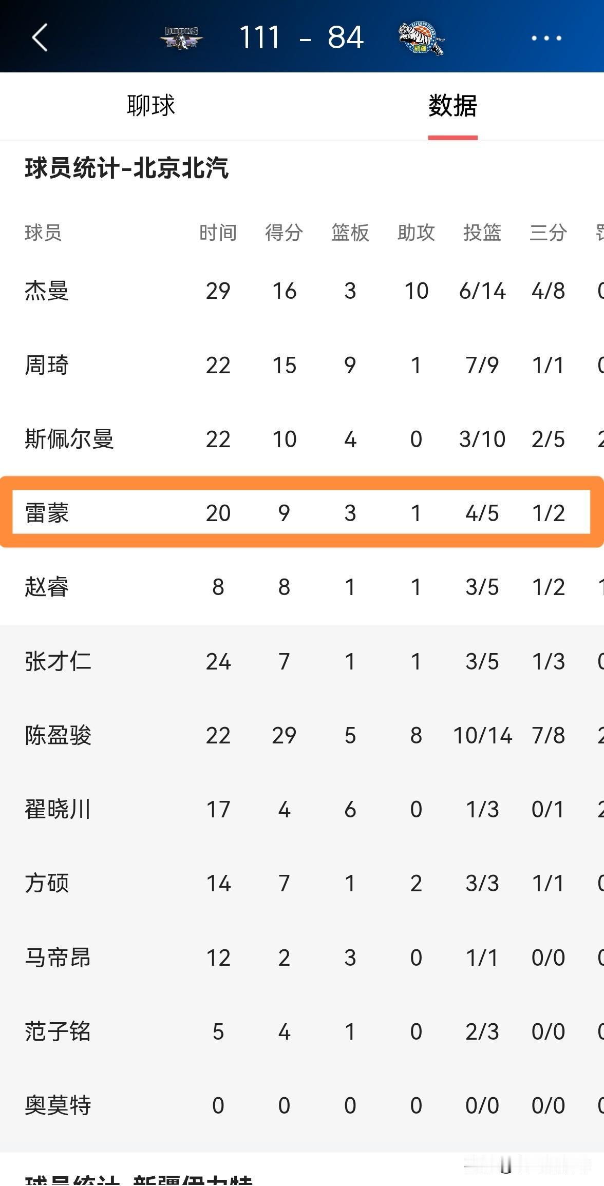 北京北汽大将雷蒙不愧是当今CBA的顶级3D!今天北京北汽在主场以111:84大胜新疆伊犁特,本场比赛雷蒙首发出战20分钟,投篮5中4,其中三分球2中1得到9分3篮板1助攻0失误,他的场上正负值为+16。 实事求是的说,本场比赛雷蒙将自己顶级3D的风采展现的淋漓尽致。