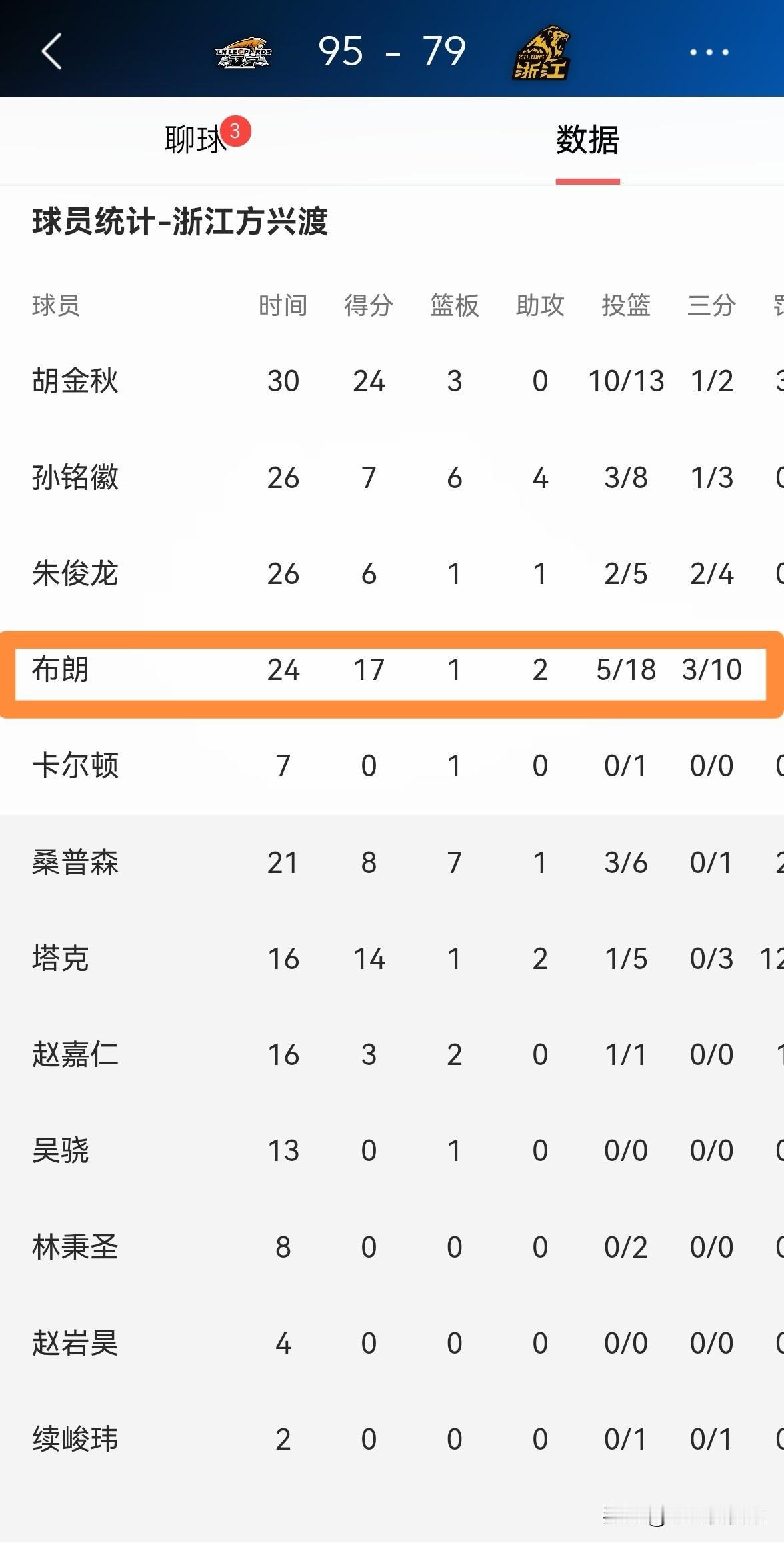 浙江方兴渡超级外援布朗一定要背锅了!今天浙江方兴渡在客场以79:95惨败于辽宁本钢,此役布朗的表现简直是糟糕透顶,他是球队输球的罪魁祸首。 全场比赛下来,布朗首发出战24分钟,投篮18中5,其中三分球10中3、罚球4中4非常低效的得到17分,还有3次失误,他的场上正负值为全队最低的-16。 作为球队的绝对核心,本场比赛布朗的表现完全是不及格的,他的进攻效率非常的低。