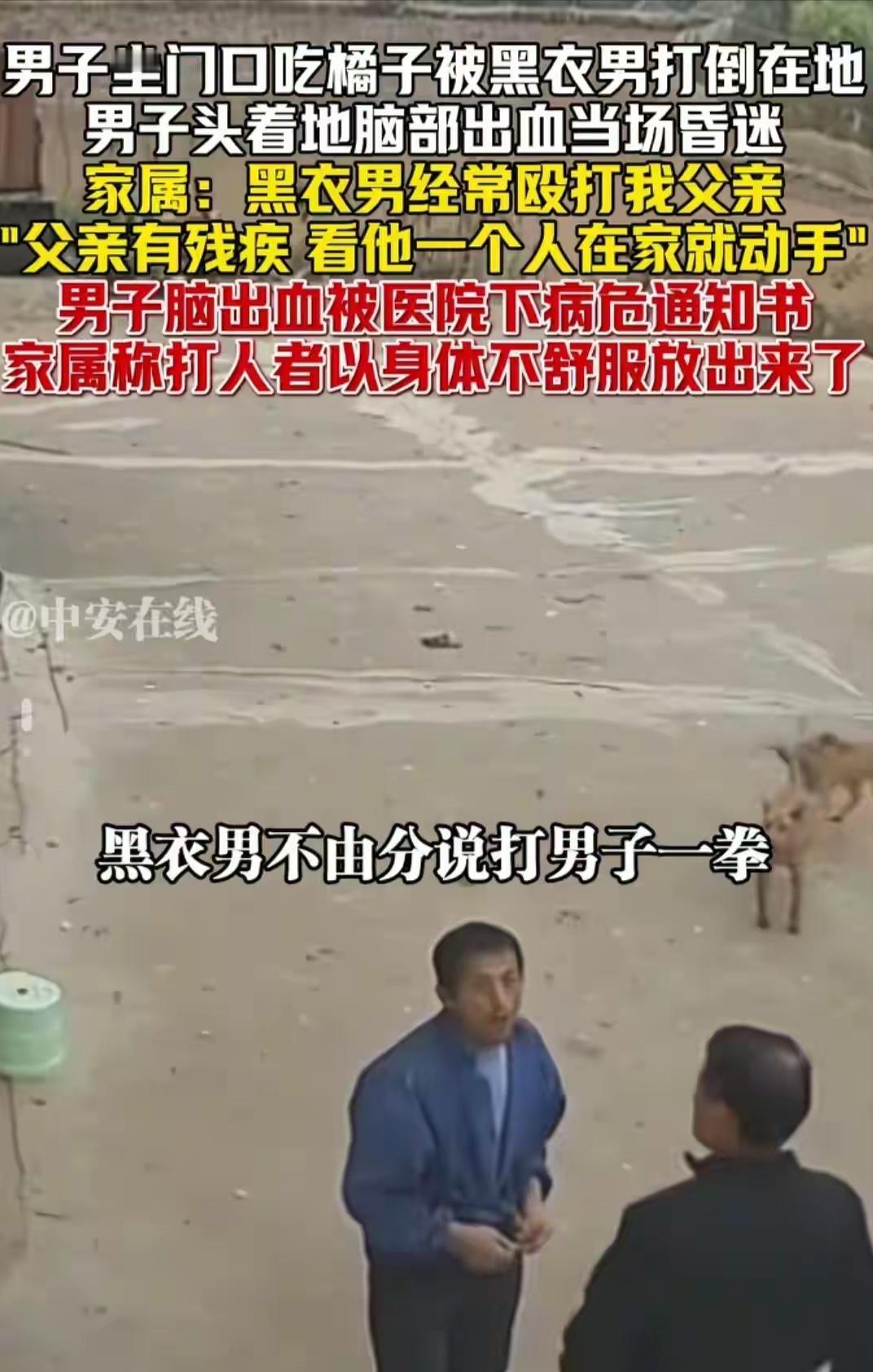 江西男子家门口遭殴打病危,家属拒和解!多次施暴者曾被释放引热议 远亲不如近邻,可江西一男子却遭遇了令人愤慨的邻里冲突。据悉,该男子(残疾人)正坐在家门口吃橘子时,遭一名黑衣男子突然殴打,后脑着地出血倒地。黑衣男子事发4分钟后才上前查看,拨打救护车时,一名拄着拐杖的老太竟上前抢夺手机,阻拦抢救。 家属透露,父亲此前就曾多次遭该打人者骚扰殴打,此前报警后,对方以身体不适为由被释放。目前男子因脑出血被医院下达病危通知书,家属已递交伤残鉴定结果,明确表示“绝不和解”。 针对打人者此前被释放一事,相关部门回应称系按程序处理。此事引发网友热议,不少人质疑“多次施暴仍猖狂”,质疑背后是否存在监管漏洞。目前多方部门已介入调查,事件后续进展备受关注。 邻里之间本应和睦相处,为何会引发如此恶性事件?期待相关部门尽快查清真相,还受害者及其家属一个公道。