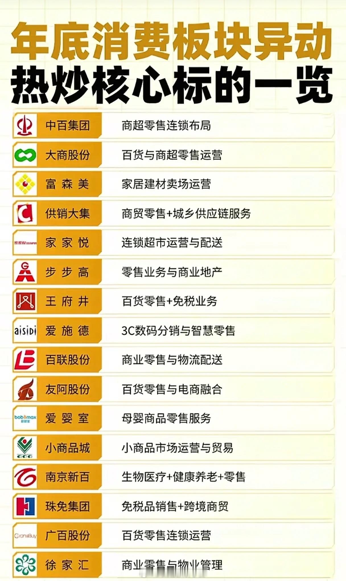 年底消费板块掀起涨停潮,零售龙头为何能成为资金抢筹的焦点?这背后绝非偶然,而是消费复苏政策落地、业态升级转型与节日消费旺季三重逻辑共振的必然结果。那些脱颖而出的零售企业,正凭借差异化布局,成为资金挖掘消费红利的核心标的。传统零售的破局之道,藏在转型的深水区里。东百集团的“商业零售+仓储物流”双轮驱动颇具看点,依托福州、兰州等物流枢纽,2025年仓储物流营收占比已达35%,冷链订单同比激增60%,用供应链优势打通了零售的“任督二脉”;百大集团跨界养老健康,旗下社区入住率超85%,健康服务成新利润引擎,跳出了传统零售的增长困局;南京新百更将生物医疗与零售融合,干细胞治疗业务联动线下健康体验店,2025年三季度净利同比增22%,用“零售+健康”的新故事打破增长天花板。线下场景的创新与渠道下沉,同样让资金眼前一亮。永辉超市推进“超市+生鲜加工”,门店现制食品收入占比升至20%,社区店数字化改造让客单价涨15%,把超市变成了“家门口的厨房”;红旗连锁的便利店接入社区团购与即时零售,日均订单破500万单,2025年四季度营收增18%,用“小而美”的灵活度抢占社区流量;孩子王、爱婴室聚焦母婴消费升级,叠加育儿咨询、早教等增值服务,客户复购率超70%,把母婴店做成了“育儿生态圈”。政策与旺季的加持,更让板块热度锦上添花。2025年12月各地发放超200亿元消费券,精准覆盖零售、餐饮,王府井、珠免集团的免税业务借势发力,销售额同比增45%;元旦、春节临近,美凯龙、富森美等家居零售迎来订单高峰,家装建材预售量涨30%。但资金从不盲目跟风,东百集团、永辉超市等被追捧的标的,2025年三季度净利润均实现正增长——业绩确定性,才是资金敢下重注的底气。说到底,消费板块的年底躁动,是消费复苏与企业转型成效的集中爆发。当零售从“单纯卖货”转向“场景服务”,从“线下单渠道”转向“线上线下联动”,那些能抓住趋势、做出差异的龙头,自然能在消费复苏的浪潮里,成为资金眼中最亮眼的星。