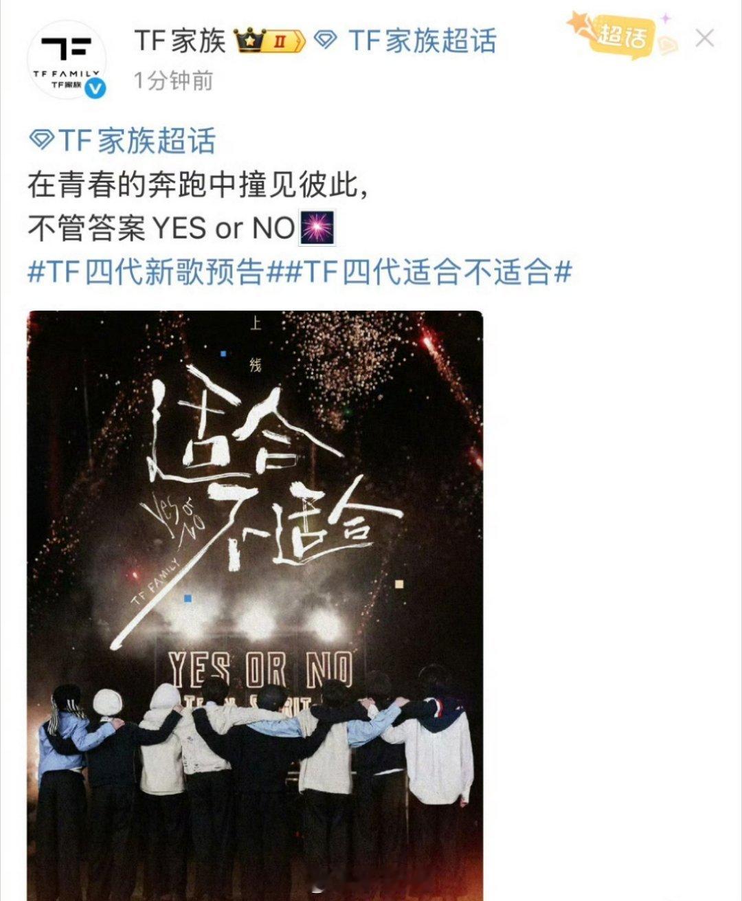 TF四代的新歌都要来了,叫做《适合不适合》,看来李飞是真的不会再给一代出团歌了,只能顺着往下来,看看能不能打造出2.0版本,你期待听到不?