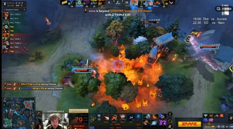 [40分钟]高地团NAVI交出所有买活就是不敲,但是团战端谁可以管得住XG的双大哥呢!最终随着Ame龙骑士无限GODLIKE,XG团灭NAVI,拿下瑞士轮第4胜挺进八强!
