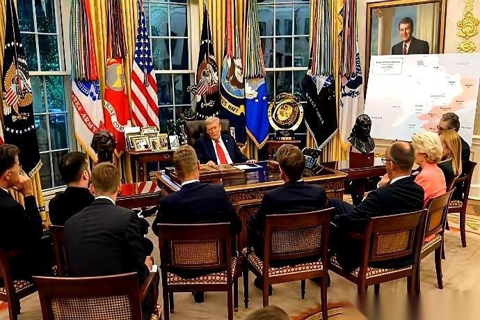 那张照片,真的,我看了半天没缓过神来。 都说世界名画,我看比什么蒙娜丽莎震撼多了。 一个屋子里,一群西装革履的体面人,围着一张巨大的地图,鸦雀无声。 特朗普就站在那儿,像个公司的霸道总裁,指着那张俄乌前线的地图,一字一句地告诉他们:别打了。 就按现在这条线,停。 你们丢了的地,就直接给人家。 欧洲那帮领导人,还有泽连斯基,脸上的表情,我跟你说,比电影都精彩。那是一种混杂着震惊、不甘,但又只能憋着的无力感。 以前总跟你称兄道弟,说咱们是盟友,有共同的价值观,要为你战斗到最后一个人... 结果呢? 到了算账的时候,人家直接把计算器拍你脸上:别谈感情,伤钱。 那一刻,什么盟约,什么道义,都成了笑话。 所谓盟友,在绝对的利益面前,可能还不如他家后院的一棵树值钱。需要的时候你是围巾,天冷了给你戴上;天热了,随手就扔了。 那个摄影师是真懂行,他摁下的不是快门。 是旧时代落幕的句号。