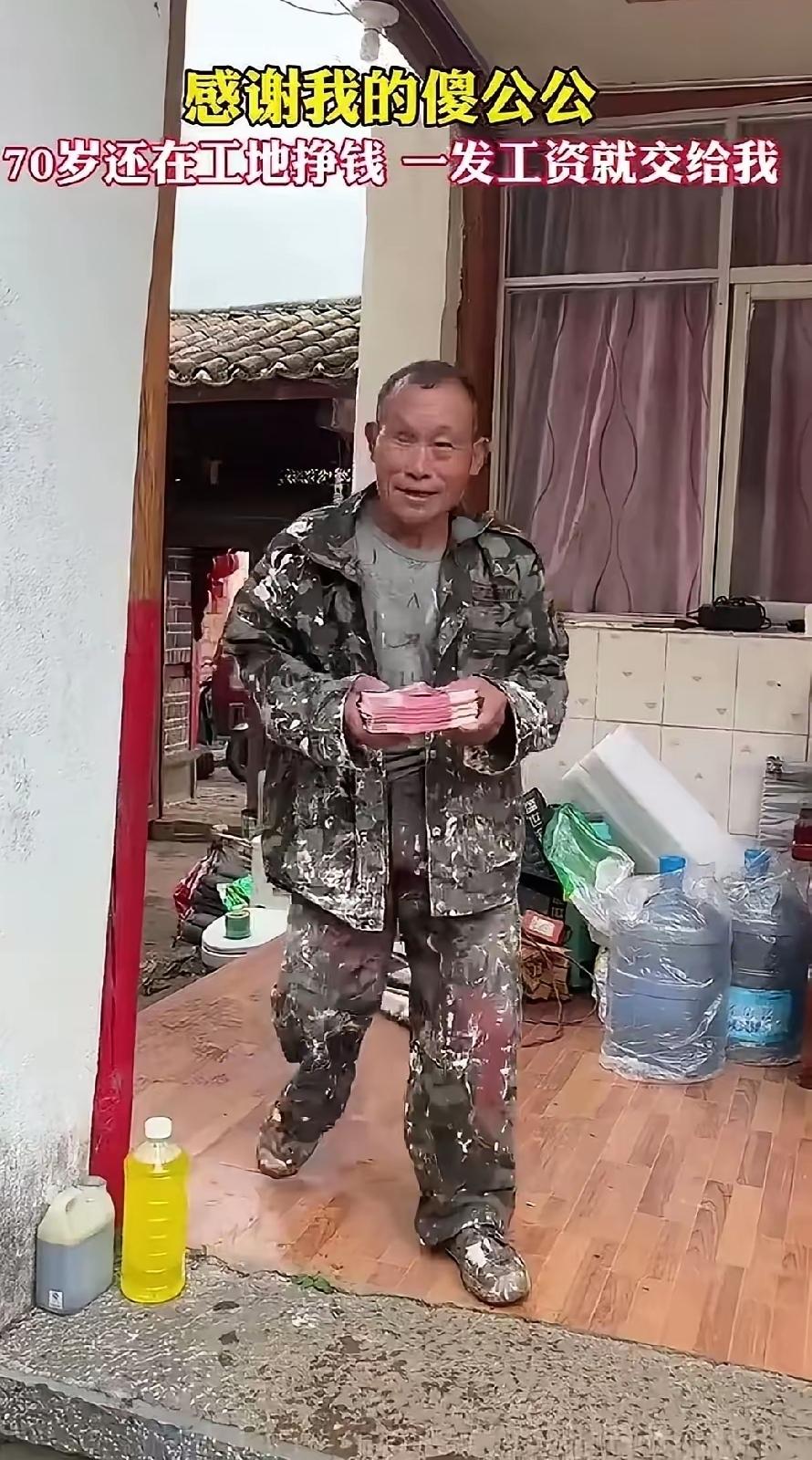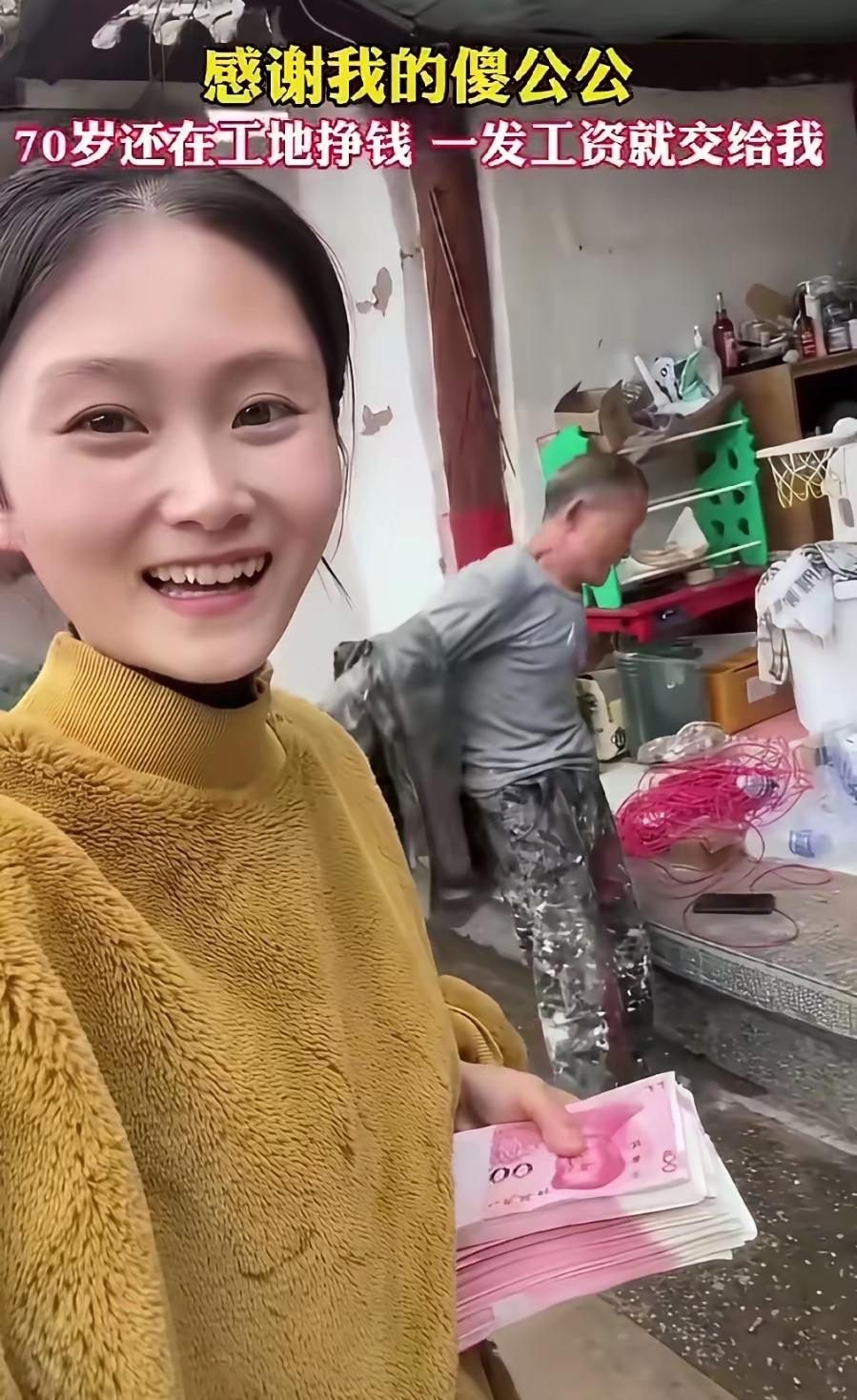女子手里拿着30000块钱,非常的开心,我的傻公公,又挣钱给我用啦! 自己的这个傻公公已经有60多了,还天天到工地上去干活,每个月挣的工钱都1分不剩的,全部给来花 视频中可以看到 一个年轻的男子正在玩手机,她口中的那个傻公公看起来有70来岁了,拿来30000块钱交到了她手上 这个老人确实勤快 但是挣的这个钱 交到儿媳妇的手上 有这个必要吗?