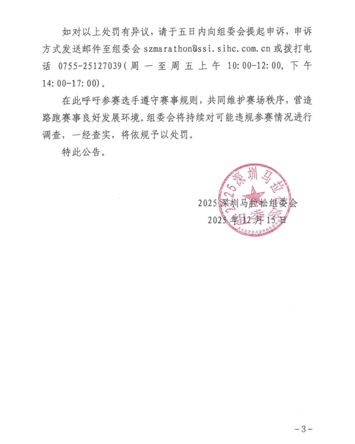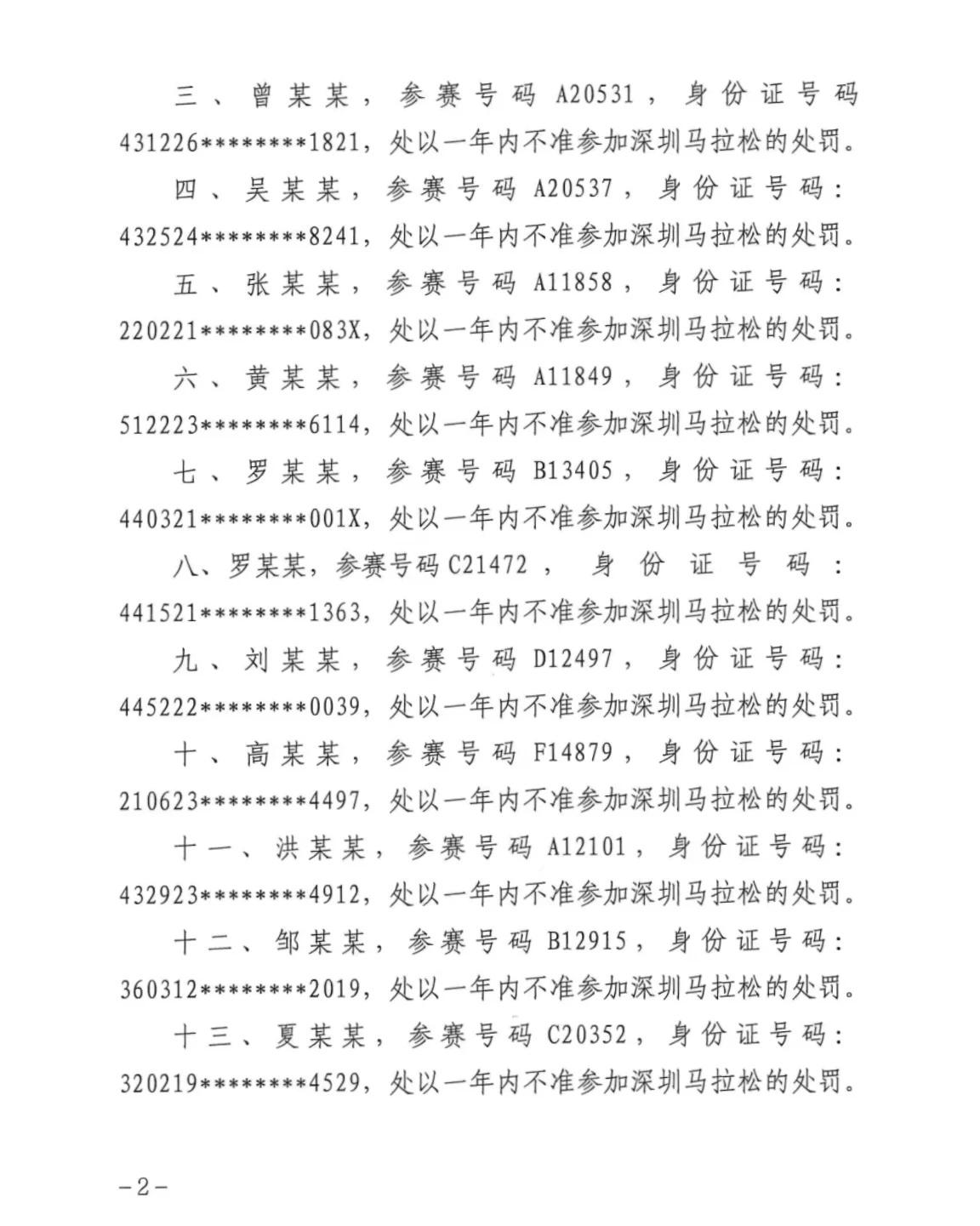 对此,深圳马拉松组委会对涉事的13人进行了相应的处罚,其中禁赛在一年或三年不等。组委会表示,经核查,在12月7日的深圳马拉松比赛中,有部分选手组织和参与非官方配速员跑团方阵活动,相关行为触及了《深圳马拉松竞赛规程》中竞赛办法第十一条,关于违反比赛规定行为中第8条“比赛中采用挤人、撞人、推人、绊人等犯规行为”和第21条“其他违反比赛规定的行为”等有关情形。