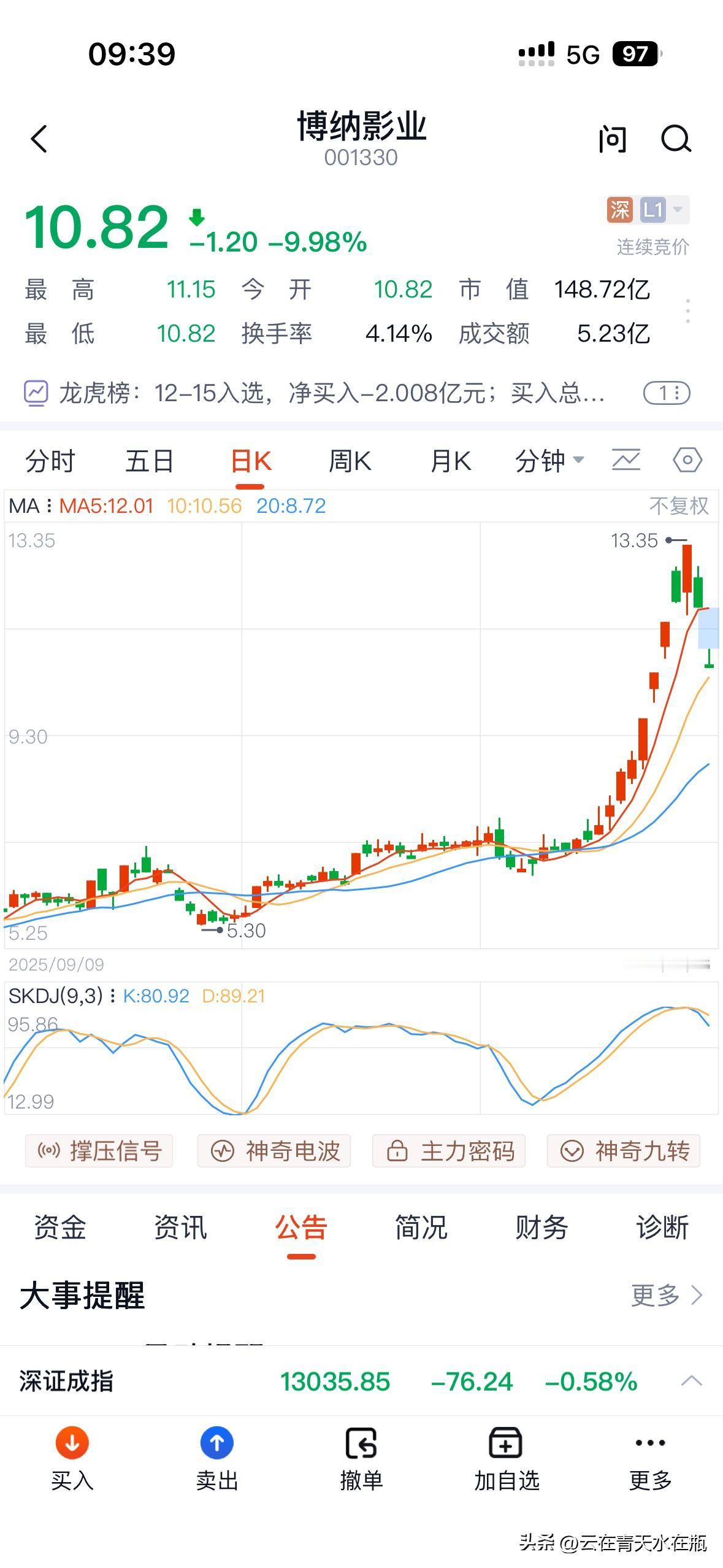 昨天看到一个群友说自己跌停买进的博纳股份,还买了阿凡达3的电影票,一副对进口大片信心十足的样子; 今早还有人说自己开盘跌停就买; 现在跌停了,群里有人把k线图挂上去,问还有人跌停买吗? 昨天买的那个人拍大腿,哎,本大仙买在半山腰上了…… 上周一直推的最鸡贼、说自己周五涨停出货了。不过他也说自己跌回去会买回来[呲牙] 有时候很有意思,看着群里的人在热闹聊天,我总是习惯于沉默不语,也从不搭话,不过会看看他们聊天的内容,这个群因为群主的缘起,把她的各种同学校友朋友客户各种有因缘的人都拉到了一起。这群每天都很热闹,有人喜欢不断的发言,也有很多人如我从来不说话。 炒股是每个人的人生课题,有人短线,有人长线。有人悲观,有人乐观。 盈亏也是自然而然。 就算昨天买进去的那位中医大夫,亏也不影响什么。 如此,甚好。