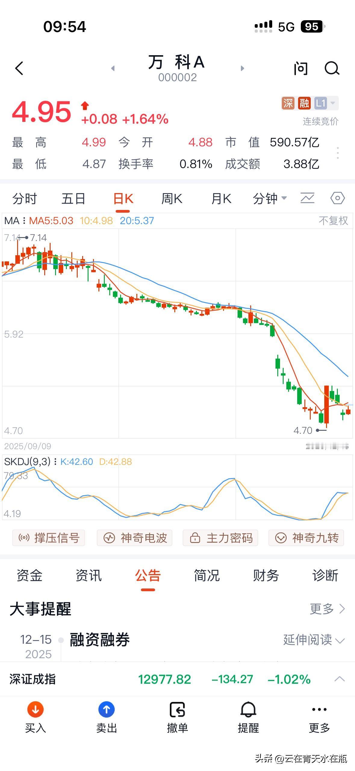 田朴珺问段永平,你还看好茅台吗?段说有什么理由不看好?田再问那你平时也不会打开账户看吗?段说看又不等于卖。 哎,王的女人两句话就露出底牌了,一个会投资有自己交易经验的人是不会问这么幼稚的问题的…… 段在万科2元的时候买进,10元的价格卖出,买入无它,评估它价格低估,卖出也无它,因为它到估值的位置了。 今日大部分股票都在稀里哗啦,万科反而表现出优等生稳稳当当的姿态。 还是很多人关注的,起心动念继而动手操作的也不少。很多人秀自己的万科账户,坚持信念的人还是坚持自己的信念,就算亏也坚持不卖,有钱还敢继续买;而那些看到债务结构变糟糕经营环境大变样的人就算亏损也要出局…… 唯一的答案,只有时间。