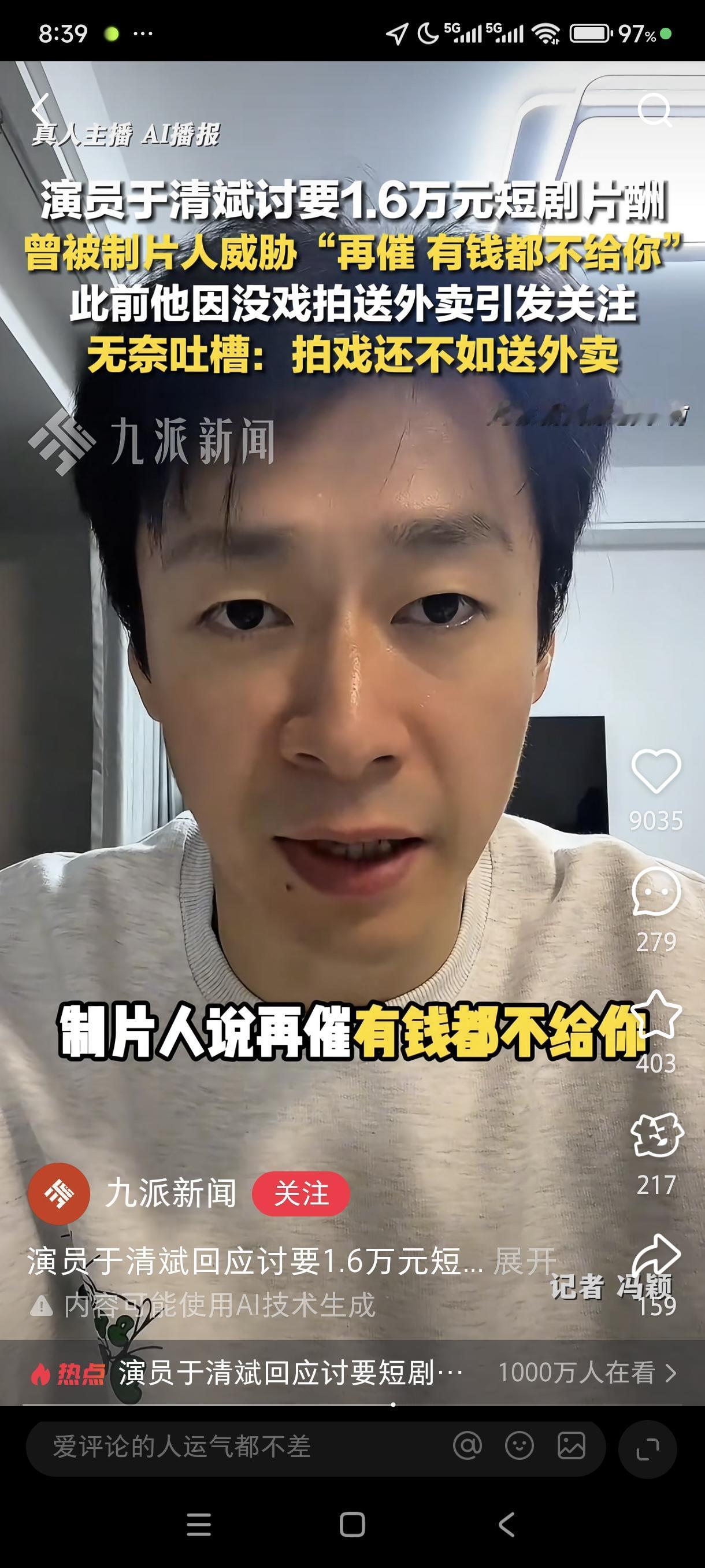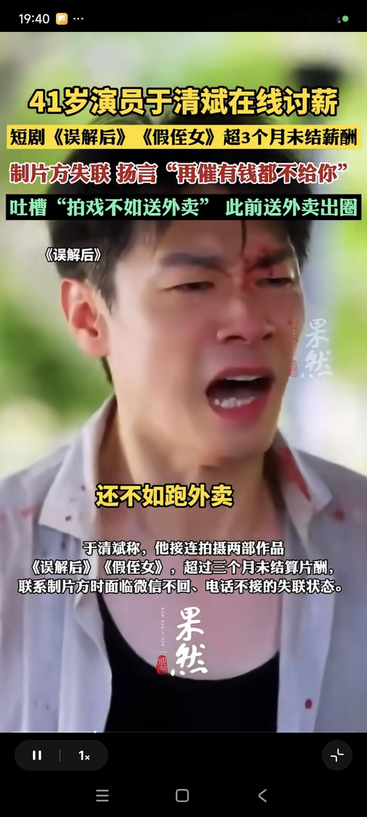 41岁演员于清斌在线向制片人讨要短剧片酬1.6万元,吐槽说“演员真是狗都不当,还不如跑外卖收入稳定,起码平台不会欠薪。”制片人电话微信统统不回,说“再催,有钱都不给你!” 面对制片人的无耻嘴脸,于清斌气的说“真是要钱的是孙子,不给的是爷爷!” 于清斌当年和朱一龙都是同一家公司的演员,多次合作影视剧,在《新边城浪子》中,朱一龙是男一号傅红雪,于清斌是男二叶开。十年后两人在娱乐圈差距巨大,朱一龙贵为影帝,片酬千万,而于清斌则沦落为短剧演员,被制片人拖欠1.6万元片酬,娱乐圈人与人的差距太大了,能不能红真的是看命啊!