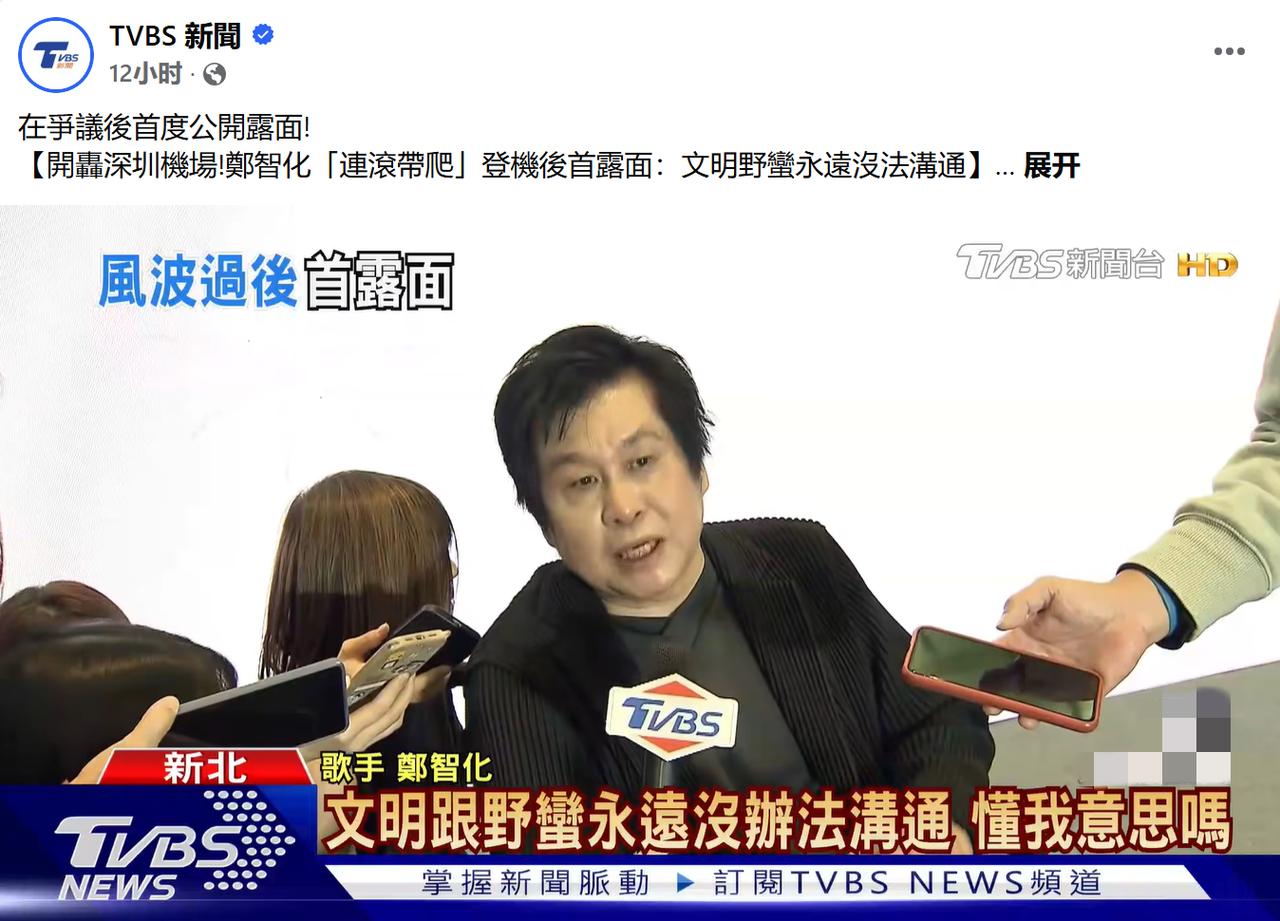 郑智化“连滚带爬”登机后首露面。他说:“文明野蛮永远没法沟通。” 台媒的标题很直