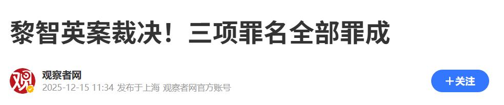 乱港分子自食恶果!2025年12月15日,乱港黑手黎智英终于自食恶果,裁决已出,三项罪名全部罪成! 就在前几日,美国众议院的个别政客抛出了一些荒谬的言论。那就是想要介入我国的内政,去拯救黎智英。 黎智英此人是一名乱港分子,更是著名的叛国乱港四人帮之一。在反中乱港事件中,它是主要的策划者和参与者。 而他之所以会反中乱港,背后更疑似有西方势力的煽风点火。或许也正因此,美国的个别政客才会提出想要拯救黎智英的言论。 针对这番言论,我国在第一时间就做出了回应,要求美国政客立即停止包庇反中乱港分子。就在这件事情带来的热度还未平息的时候,关于黎智英的裁决下来了。 2025年12月15日上午的时候,香港特区高等法院裁决,黎智英两项串谋勾结外国势力罪以及一项串谋发布煽动刊物罪成立。 这份裁决立即成为国际关注的焦点,此前我国外交部发言人在回应相关事情的时候,就曾指出,中央政府坚定支持香港特区依法维护国家安全,惩治危害国家安全的犯罪行为。 黎智英的行为已经严重的危害了国家利益,危害了国家的安全。所以香港特区对其做出的惩罚,更是令人感到了大快人心。 现在的黎智英已经不年轻,而据知情人士透露,他的健康状况已经非常的欠佳。这起案件也再次警告着其他有反中乱港心思的人,国家安全绝对不允许任何势力破坏。 对此,你怎么看?欢迎评论区留言您的看法。 (信息来源:黎智英案裁决!三项罪名全部罪成-观察者网)