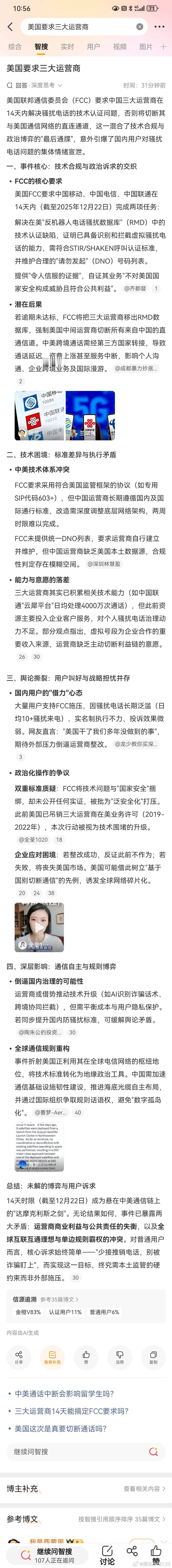 美国要求三大运营商典型的美式霸权:你不解决问题,我就解决你。美国联邦通信委员会(FCC)要求中国三大运营商在14天内解决骚扰电话的技术认证问题,否则将切断其与美国通信网络的直连通道,这一混合了技术合规与政治博弈的"最后通牒"。