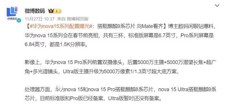 我落后了,刚刚学习了一下:红枫影像是去年在华为Mate 70系列首发的新技术,主要就是增加了一枚红枫原色摄像头。简单来说,这枚镜头拥有150万多光谱通道(8通道,3×3),可捕捉丰富的环境光谱信息,赋能给主摄、超广角和长焦微距摄像头,让色彩还原准确度提升120%。华为nova15或将搭载前后置双红枫华为nova15有望迎来全系大升级