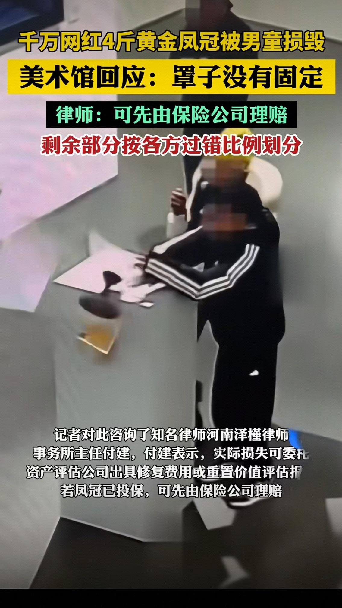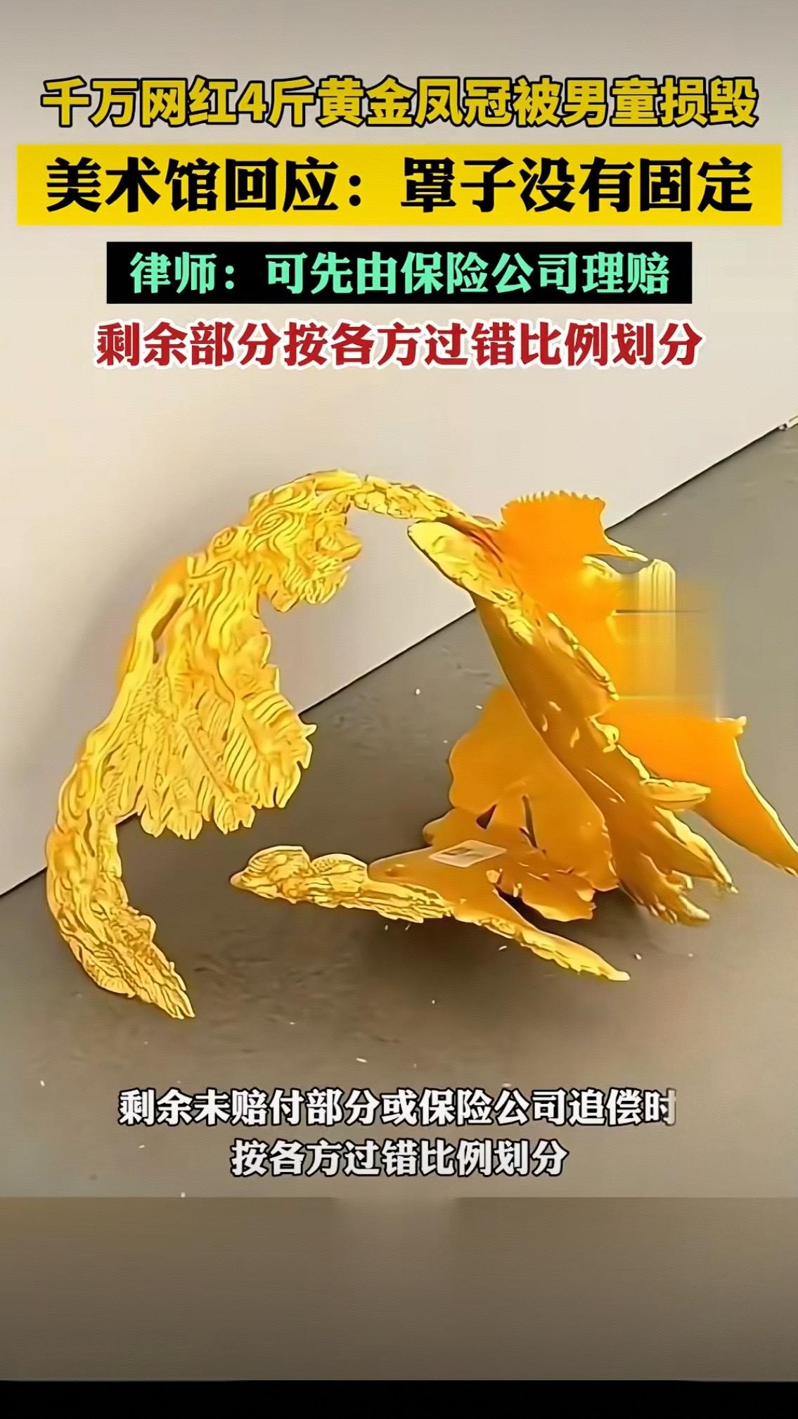 4斤黄金凤冠被男童碰碎:不是谁弱谁有理,这3个真相戳中所有人 12月13日,千万网红张凯毅发布的一则视频引爆全网:她丈夫亲手打造的4斤重黄金凤冠,在一场免费公益展览中,被一名男童触碰后掉落损毁。监控画面里,男童对着展柜罩子哈气后伸手擦拭,未固定的罩子连带凤冠瞬间坠地,而一旁的监护人正专注于用手机拍摄,全程未曾制止。美术馆一句“罩子没有固定”的回应,让责任划分成为热议焦点,律师明确表示可先由保险公司理赔,剩余损失按各方过错比例分摊。 这场看似偶然的意外,实则藏着太多值得深思的细节。张凯毅在视频中反复强调,这顶凤冠对她意义非凡——不是市场上能买到的商品,而是丈夫倾注心意的结婚信物,承载着两个人的爱情记忆。更难得的是,这场展览以“爱”为主题,汇集了87位艺术家的上百件作品,全程免费开放,主办方不仅请了保安,还特意加装了保护罩,初衷是想让更多人感受艺术的温度。可谁也没想到,一份善意最终换来的是心爱之物的损毁。 事件发酵后,网友的观点瞬间撕裂。有人怒怼监护人:“孩子小不是免责金牌,看展时盯紧孩子是基本责任”;也有人质疑主办方:“4斤重的黄金展品,居然用未固定的罩子,这不是形同虚设吗”;还有人担心:“手工打造的凤冠损坏严重,修复费可能比重做还高,这损失谁来扛”。这些争论的背后,其实是大家对“规则”与“责任”的共同关注。 从法律层面看,责任划分其实很清晰。根据《民法典》,未成年人造成他人损害的,由监护人承担赔偿责任,视频中监护人未及时制止孩子的危险行为,显然未尽到监护义务;而展览方作为公共场所管理者,未能为高价值展品配备稳固的防护设施,违反了安全保障义务,同样存在过错;若展柜设计本身存在缺陷,设计方也需承担相应责任。好在凤冠已投保,可先由保险公司理赔,但这并不意味着过错方可以免责,剩余损失仍需按比例分摊。 但比责任划分更值得反思的,是当下公共展览中普遍存在的问题。近年来,免费展览越来越多,可部分观众的观展素养却没跟上:随意触碰展品、追逐打闹、用闪光灯拍照等行为屡见不鲜。就像有网友说的:“免费不代表可以肆意妄为,尊重展品就是尊重艺术,也是尊重主办方的善意”。而主办方也该吸取教训,高价值展品的防护措施必须与其价值匹配,不能让“免费”成为安全缺位的借口。 张凯毅在评论区的补充更让人动容:“从未向小孩家索赔,发视频只是想问问定损建议,没想网暴谁”。这份克制与理性,让事件少了几分戾气,多了几分温度。毕竟,谁都不想看到意外发生,孩子并非故意,主办方也满怀善意,这场悲剧的根源,是规则意识的缺失和安全措施的疏漏。 这件事也给我们所有人提了个醒:逛展时,家长要看好孩子,守住“不触碰展品”的底线;主办方要把安全放在首位,不让善意变成遗憾;而我们每一个人,都该学会在公共空间里尊重他人、遵守规则。艺术的美好,需要我们共同守护。 你觉得这场意外中谁的责任更大?如果是你遇到这种情况,会怎么处理?欢迎在评论区留下你的看法~4斤黄金凤冠在免费展上被毁