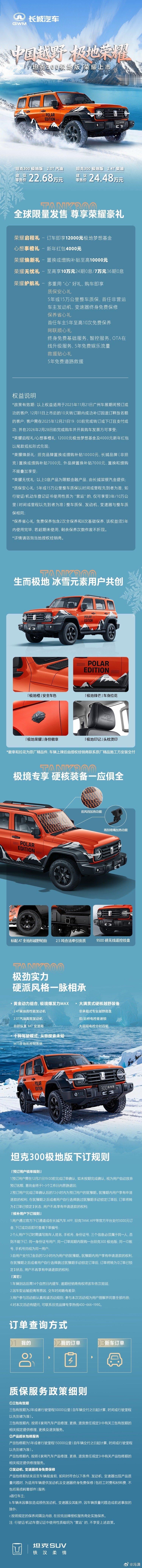坦克300又一个新版本极地版上市,汽油版22.68万,柴油版24.48万。很多人说这车怎么出那么多版本?其实这是好事呀,越野车就是这样很多成功的车型都很多版本,满足各种个性需求也是越野车型的一大特点。而且也别嫌弃版本多外观不变,作为车主反而希望造型一直这样就好,哪怕换代升级也把外观延续下来,若干年后也是经典造型了。