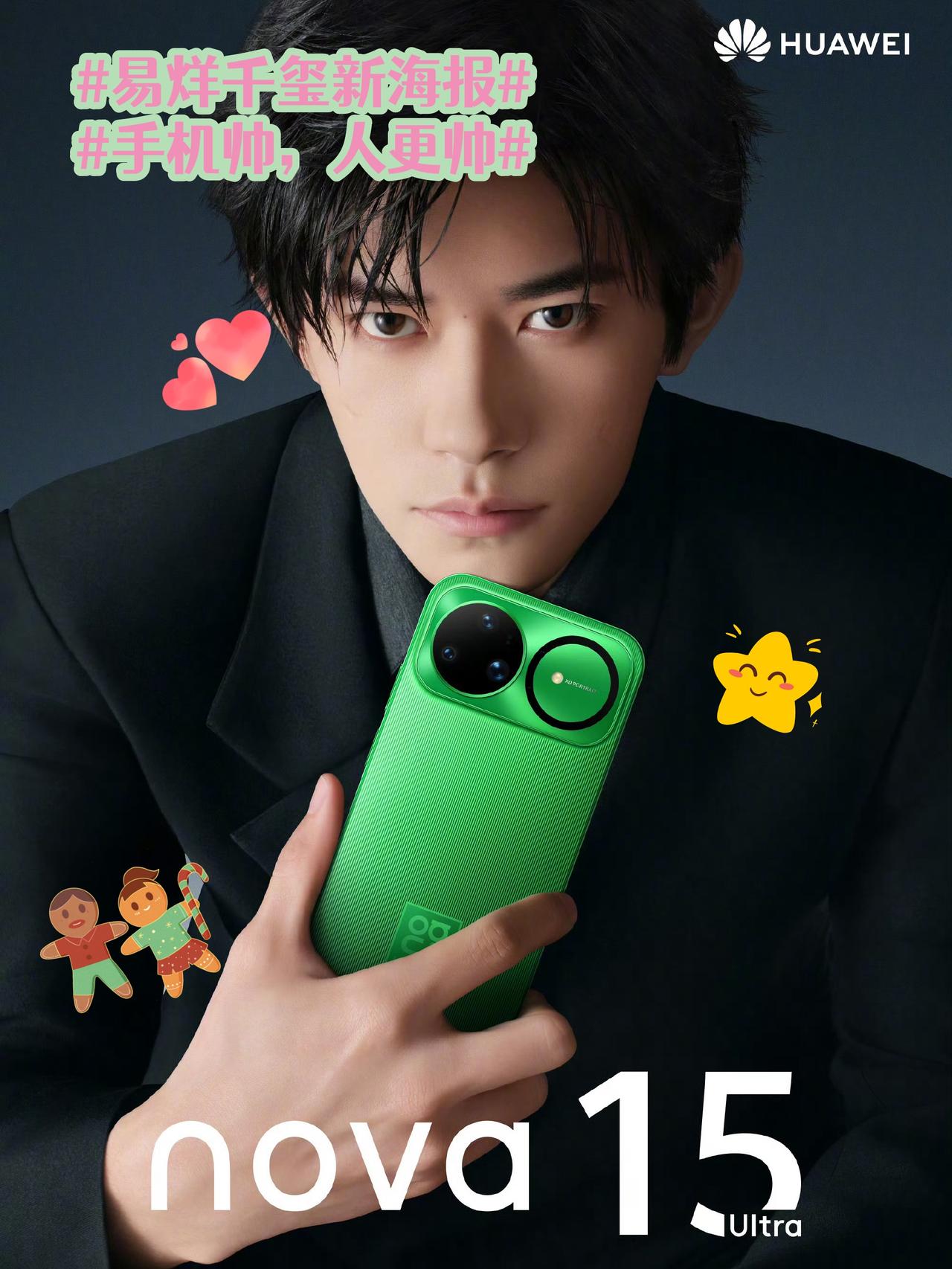 真不是粉丝滤镜厚💓易烊千玺是真帅 千玺又有新海报了~ 手上拿的应该是华为Nova 15 Ultra 人帅,手机也挺帅的😍 这背部ID设计,你觉得好不好看? 横向立体双圆deco有点东西 搭配挺阔的直屏设计,辨识度很高 还有这个绿色,有点高级的样子 不得不说玺子哥同款真是时尚搭子,坐等12月22日发布会~不知道千玺会不会去现场?