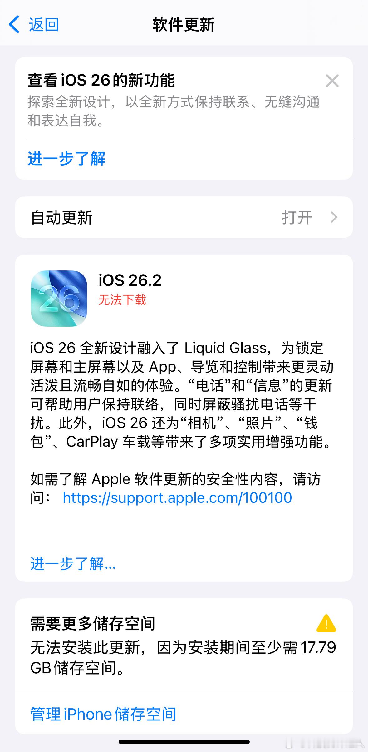 苹果安卓实现互通我连iOS26.2都还没更新,刚开始买的内存太小了,现在更新下载
