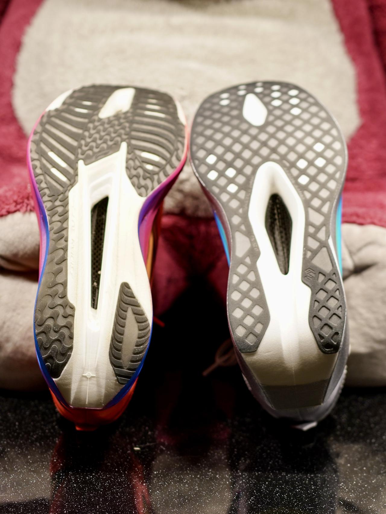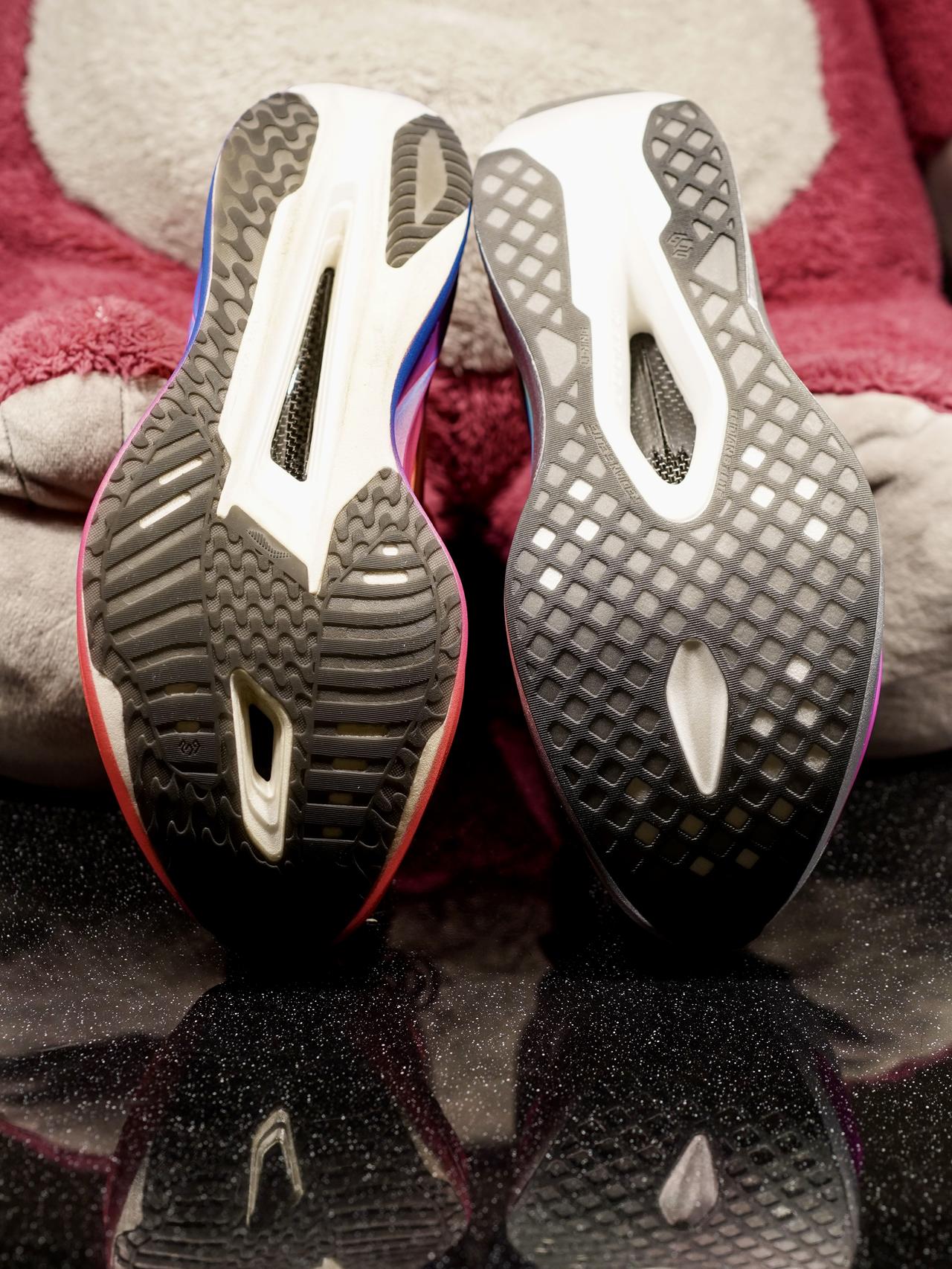 相比5E,飞电6E的中底不光改成超䨻胶囊+超䨻的组合,下层的超䨻也明显调校的更软——改进方向和adios pro 3→4类似。