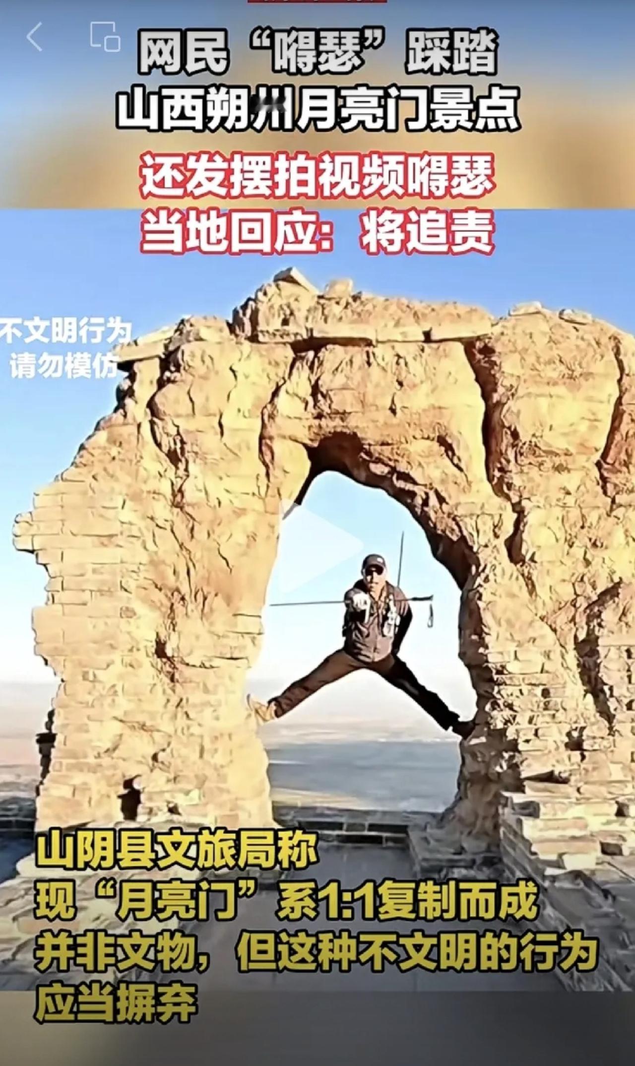 男子长城"月亮门"上嘚瑟摆拍,网友怒批:这是修复的心血!官方回应亮了! 山西朔州新广武长城,一男子直接踩上“月亮门”摆拍,手脚并用耍帅,那嘚瑟样看得人火大! 网友直接炸了: “把文物当跳板?文保心血全白费!” “素质堪忧,必须严惩!” 我真的想吐槽: 为了流量连敬畏心都没了? 长城可是文化符号啊! 结果官方回应反转全网: 这是2016年原门被风吹塌后,1:1复刻的保护建筑,不算文物,但绝不纵容不文明行为!目前正查男子身份,追责到底! 网友辣评笑喷: “踩A货还惹一身骚,血亏!” “素质比古门还该修!” “建议让他掏复刻费+公开道歉!” 其实不管是不是文物,公共景观都该被尊重!打卡别越界,文明才是真帅 ~ 你觉得该怎么罚?评论区聊聊!