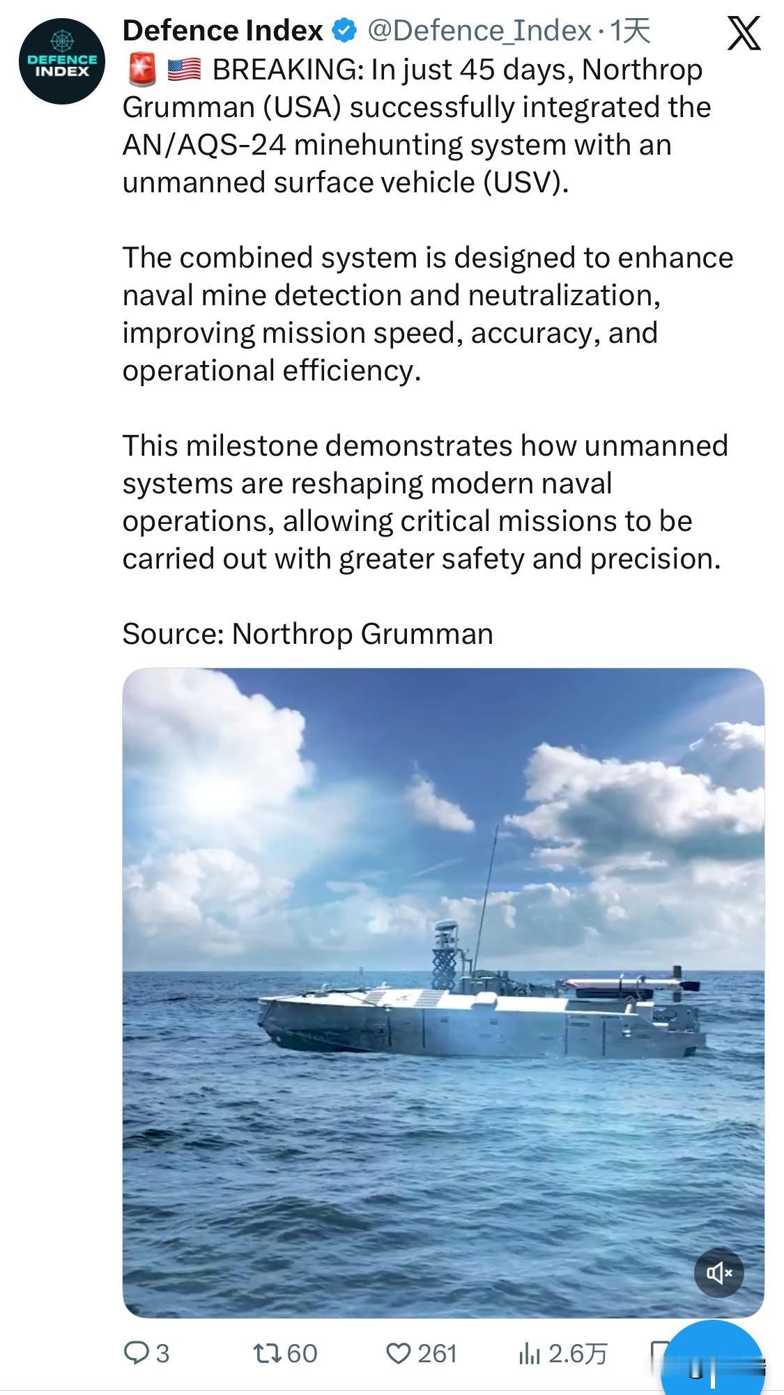 突发新闻:仅用了 45 天,诺斯罗普·格鲁曼公司(美国)就成功地将 AN/AQS-24 扫雷系统与无人水面艇(USV)集成在一起。 该组合系统旨在增强海军水雷探测和清除能力,提高任务速度、准确性和作战效率。 这一里程碑表明,无人系统正在重塑现代海军作战,使关键任务能够以更高的安全性和精确度执行。 诺斯罗普·格鲁曼公司(Northrop Grumman Corporation)是一家全球知名的美国航空航天和防务技术公司,也是全球最大的防务承包商之一。 诺斯罗普·格鲁曼是美国主要的军工生产厂商,被认为是全球第三大军工生产商,也是最大的雷达和海军舰船制造商之一(尽管造船业务后来有所调整)。