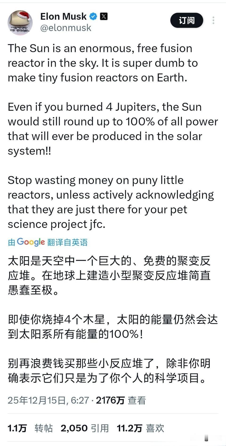 马斯克反对中国建造核聚变。2025年12月15日,马斯克在社交平台X上再度语出惊人,将地球上建造小型核聚变反应堆的行为痛斥为“愚蠢至极”。他的核心论点直白且尖锐:天空中早已存在一个巨大且免费的核聚变反应堆——太阳,其释放的能量足以覆盖全太阳系需求,人类耗费巨资打造“微型版本”纯属经济浪费。