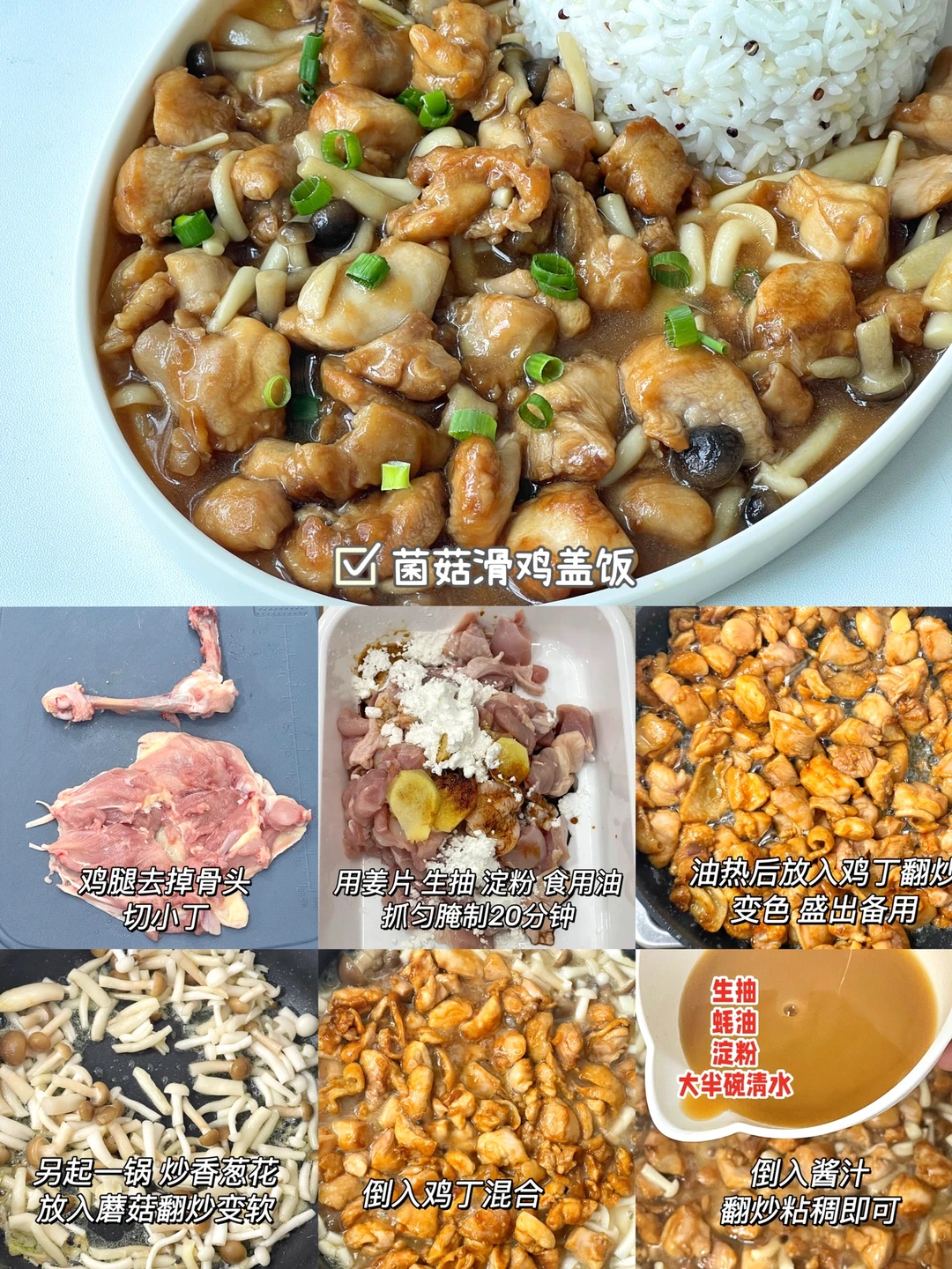 🔹油热后放入鸡丁快速翻炒变色盛出备用。另起一锅,炒香葱花放入菌菇翻炒变软,再混入鸡丁,倒入调好的酱汁(酱汁:生抽+耗油+淀粉+大半碗清水)翻炒至粘稠即可。