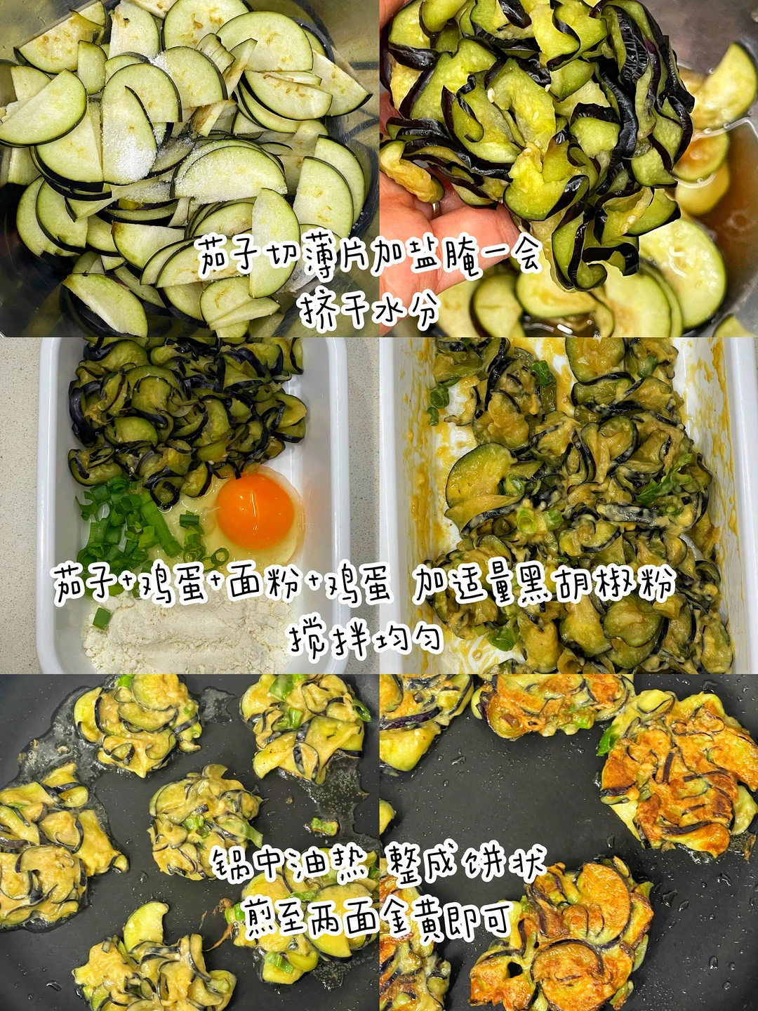 "香!脆!软!糯!这个茄子鸡蛋饼,好吃到我想原地摆摊!!求你们快去试!" ✅准备食材:茄子、鸡蛋、小葱、面粉 ✅制作方法: 🔹茄子洗净切薄片,放一勺盐腌制一会,挤干水分. 🔹茄子+鸡蛋+葱花+适量面粉+一勺黑胡椒粉搅匀. 🔹整成饼状,锅中油热依次放入煎至两面金黄即可.