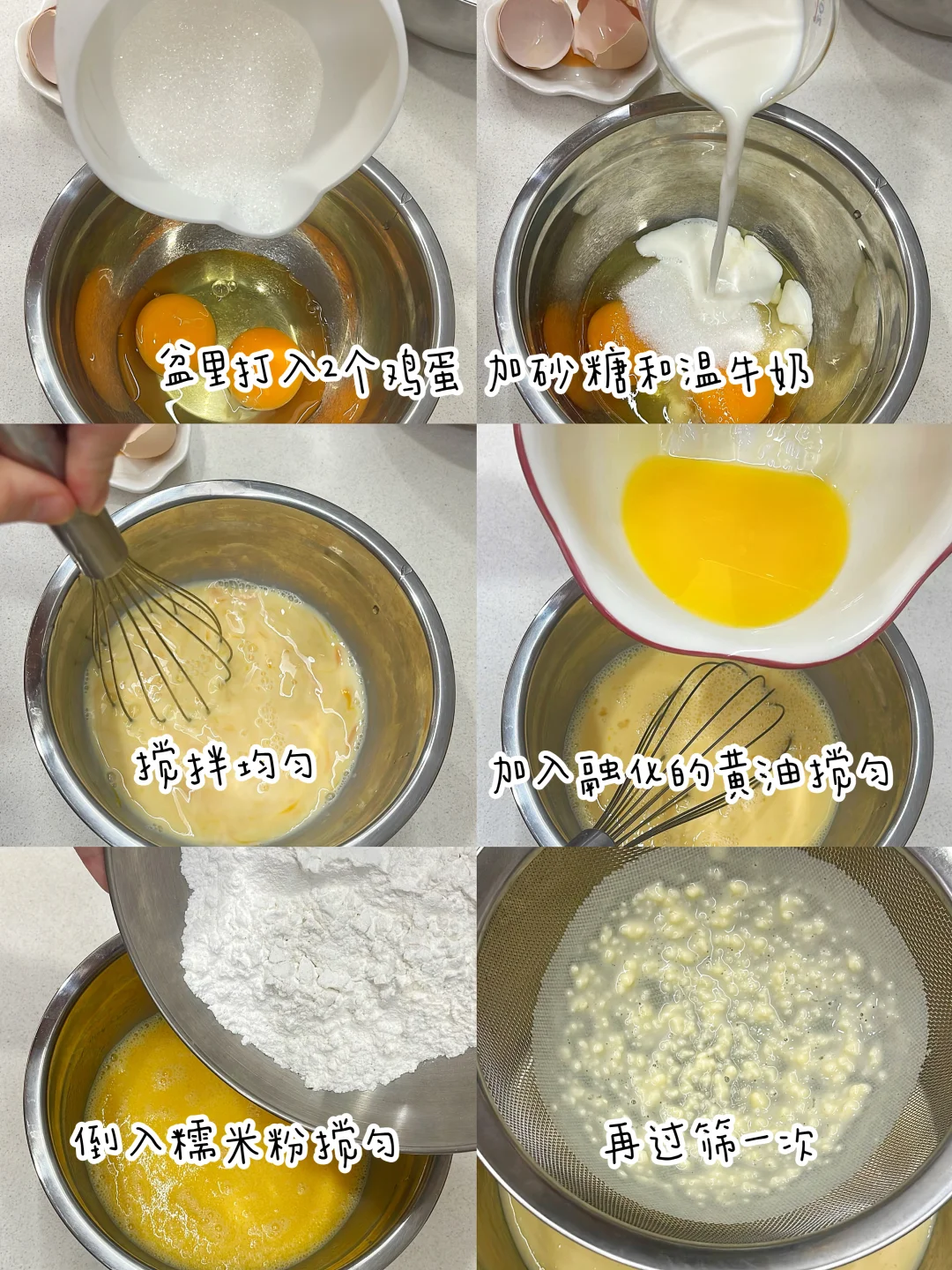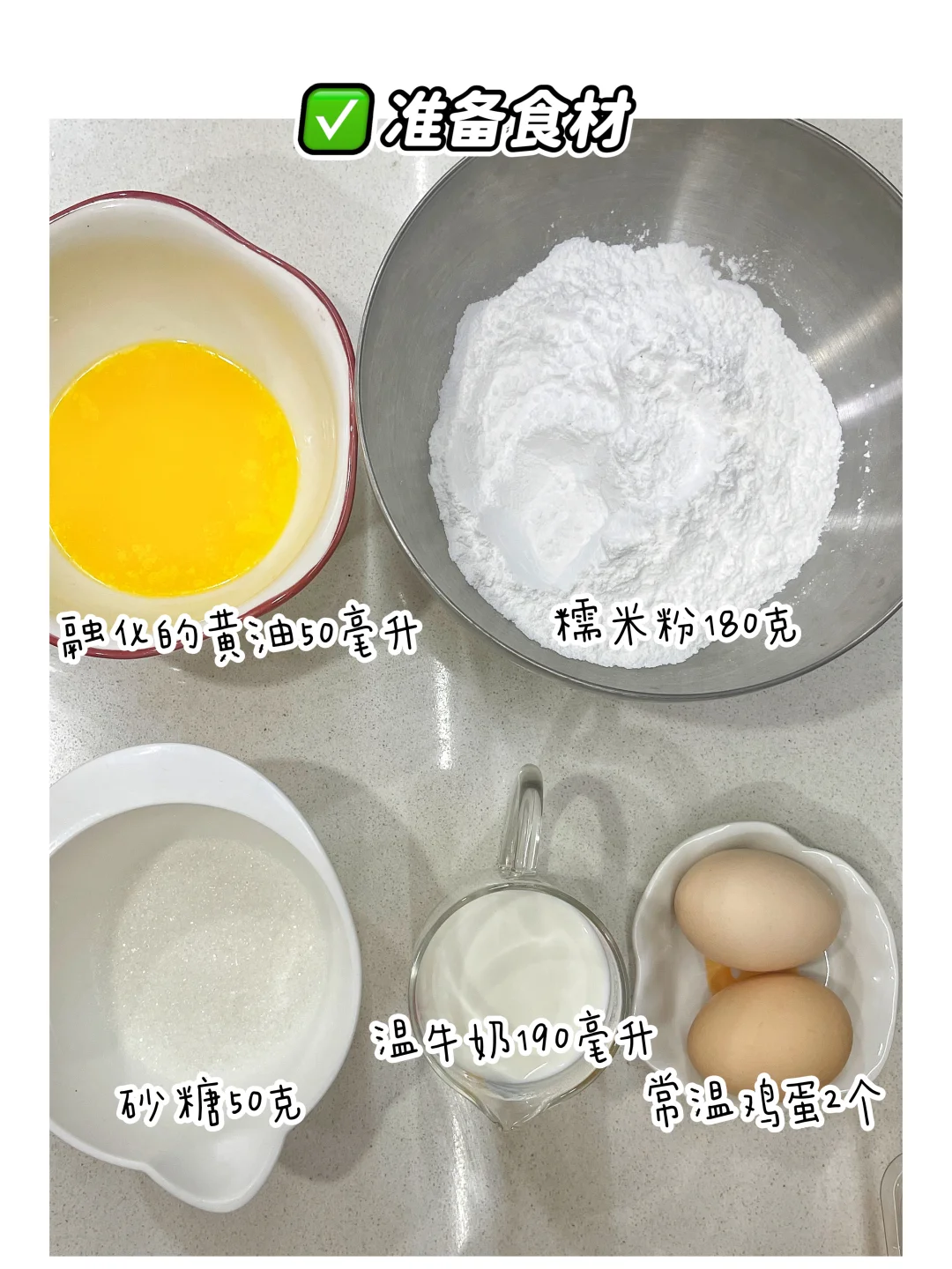 喜欢糯叽叽口感的一定要试试今天这款脆皮黄油年糕,真的太好吃了,做法还简单有手就会[偷笑R] ✅准备食材:糯米粉180克、温牛奶190毫升、融化的黄油50克、常温鸡蛋2个、砂糖50克. ✅制作方法: 🔹无水无油的盆里打入2个鸡蛋,加入砂糖和温牛奶搅拌均匀. 🔹倒入融化的黄油搅匀. 🔹再加入糯米粉搅拌至无干粉状态,过筛一遍. 🔹模具里刷一遍软化的黄油,再倒入面糊. 🔹放入预热好的烤箱。上下管180度30分钟. 🔺具体烘烤时间根据自家烤箱脾性,对应调整即可.