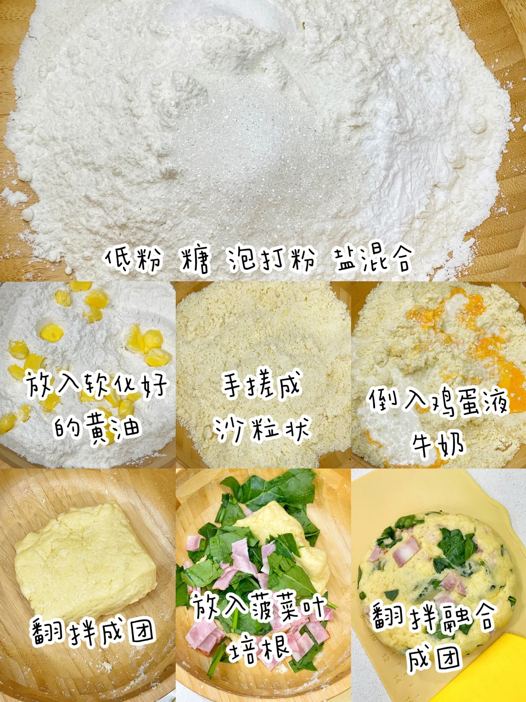 分享一款一次就能成功的司康做法❗️菠菜培根司康,不同以往是咸的口味,也非常好吃哦😋 ✅准备食材;低粉180克、泡打粉5克、糖10克?盐2克、黄油60克、牛奶50克,鸡蛋液30克. ✅制作方法: 🔹低粉+泡打粉+糖+盐混合,放入软化好的黄油,双手搓成沙粒状. 🔹倒入鸡蛋液和牛奶,翻拌成团. 🔹放入切好的菠菜叶和培根丁,翻拌融合. 🔹分成50克大小,揉成团按平. 🔹表面刷蛋液,放入烤箱180度25分钟.