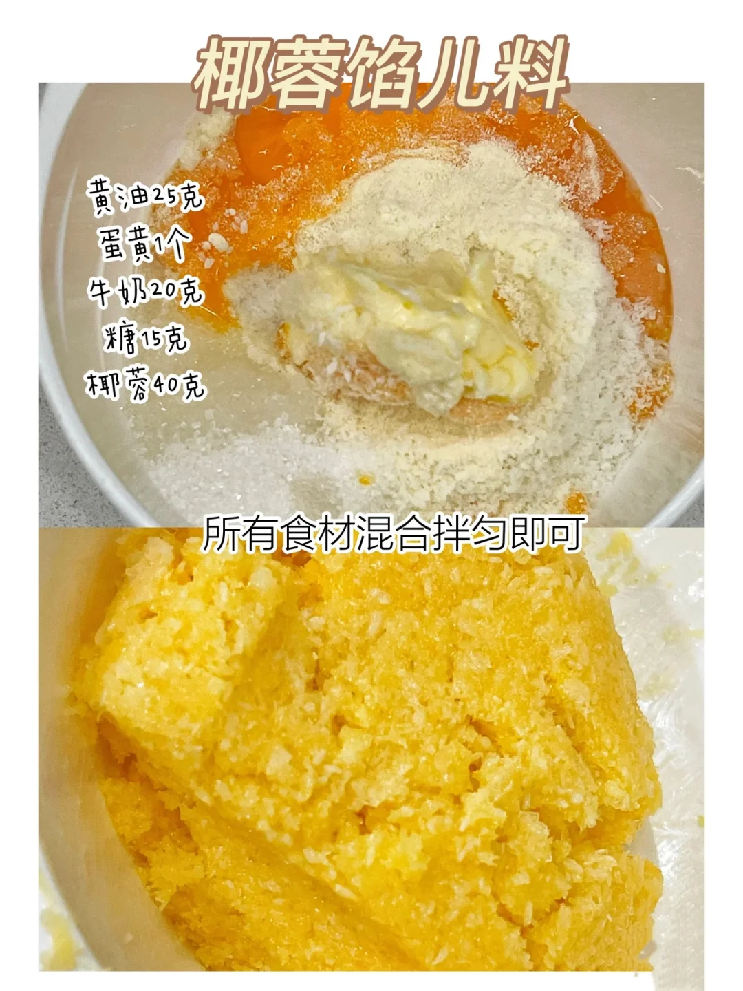 ✅椰蓉馅准备食材:黄油25克、蛋黄1个、牛奶20克、糖15克、椰蓉40克。