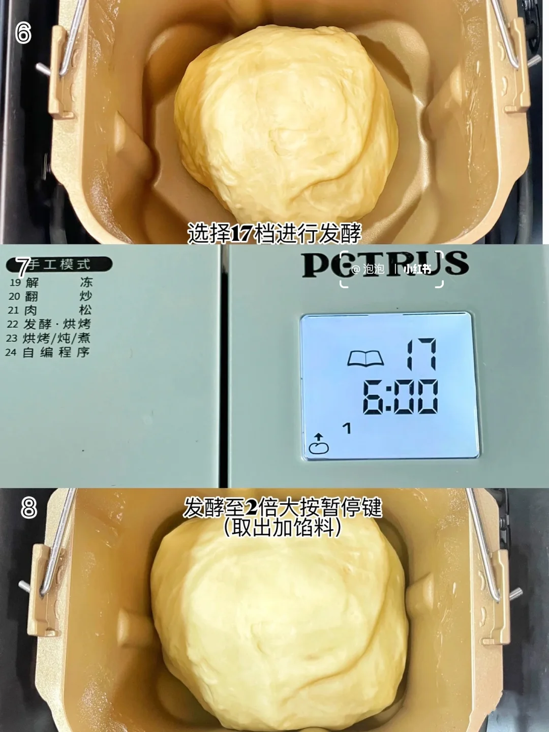 🔹揉好的面团选择17档模式进行发酵,发酵至2倍大的时候,暂停此模式,取出加馅料。