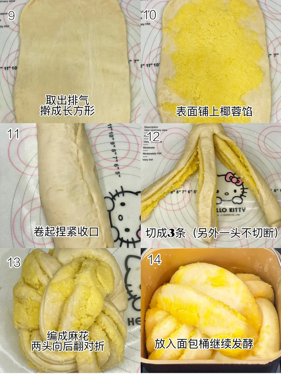 🔹取出面团排气擀成长方形,表面铺满椰蓉馅,卷成卷,捏紧收口,竖着切成3条(另外一头不切断)编成麻花状,两头后翻折叠起来放回面包桶.