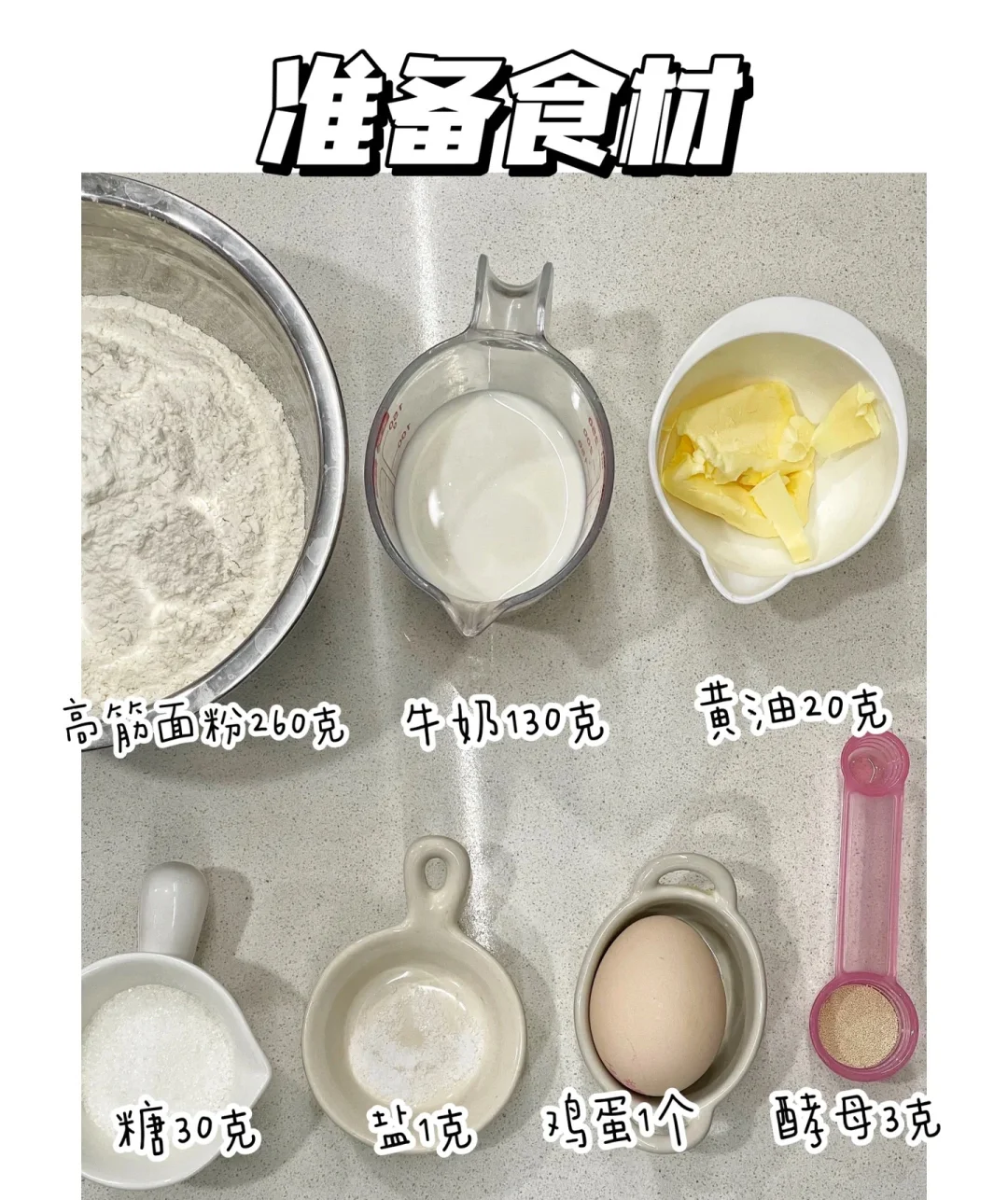 ✅吐司准备食材:高筋面粉260克、牛奶130克、黄油20克、糖30克、盐1克、鸡蛋1个(打出的蛋液约45克)、酵母3克。