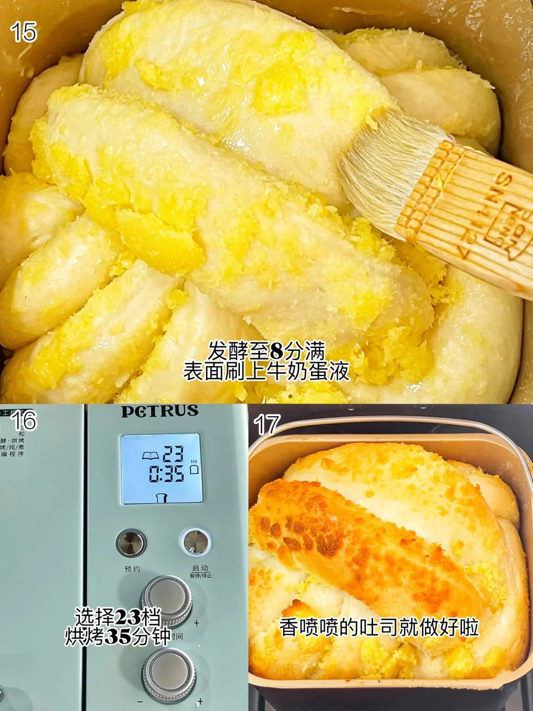 🔹按开始键继续发酵模式,直到发酵至8分满,表面刷牛奶鸡蛋液,改成23档模式烘烤35分钟即可。