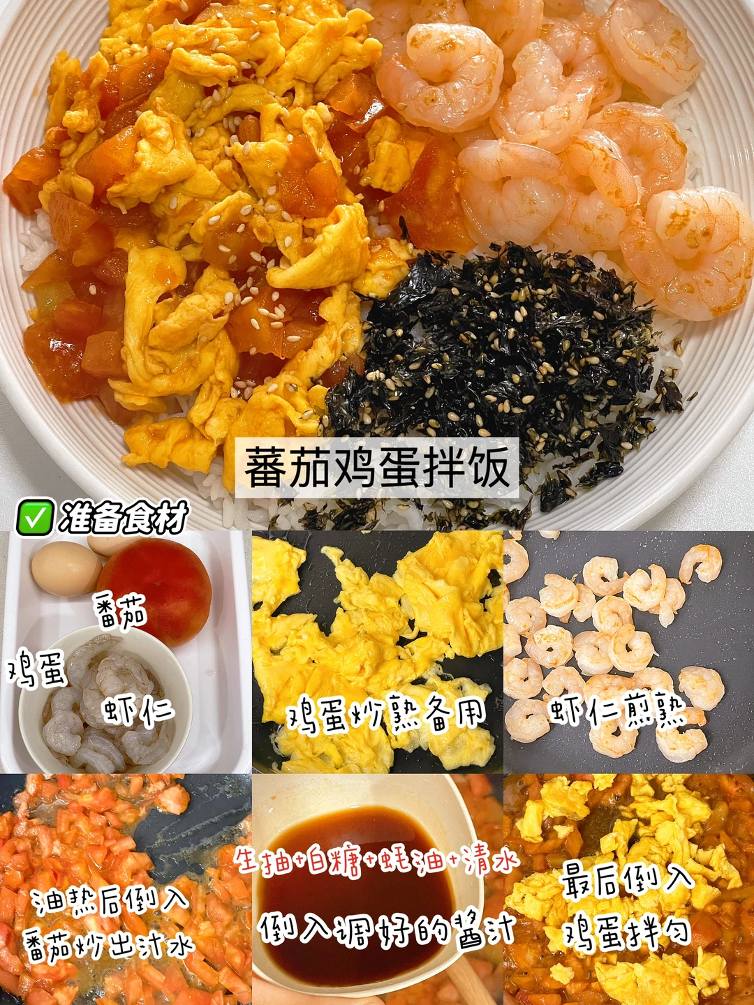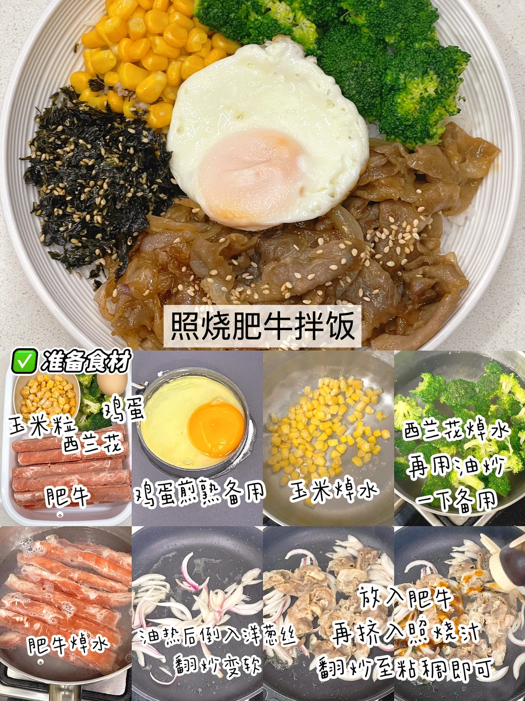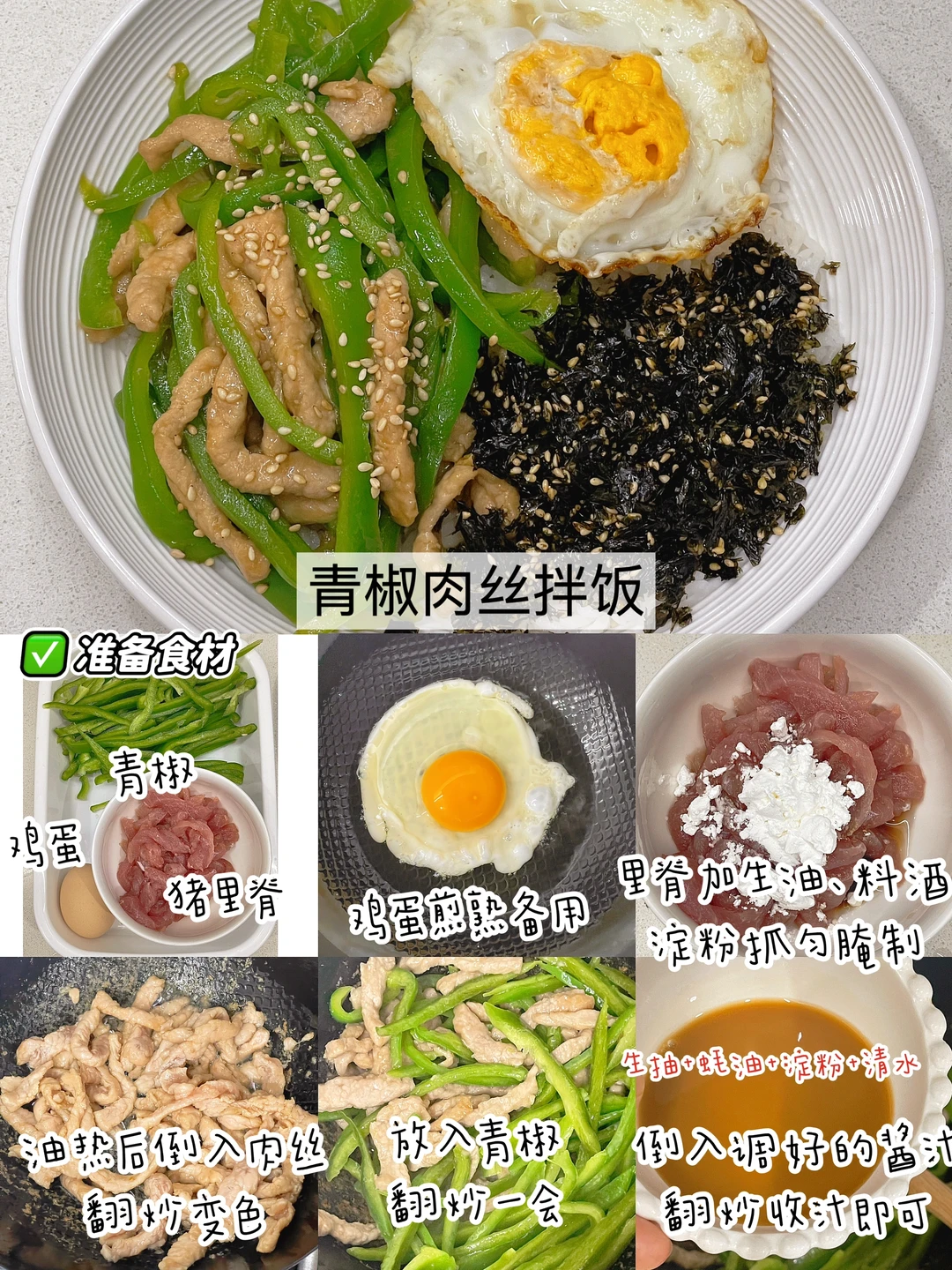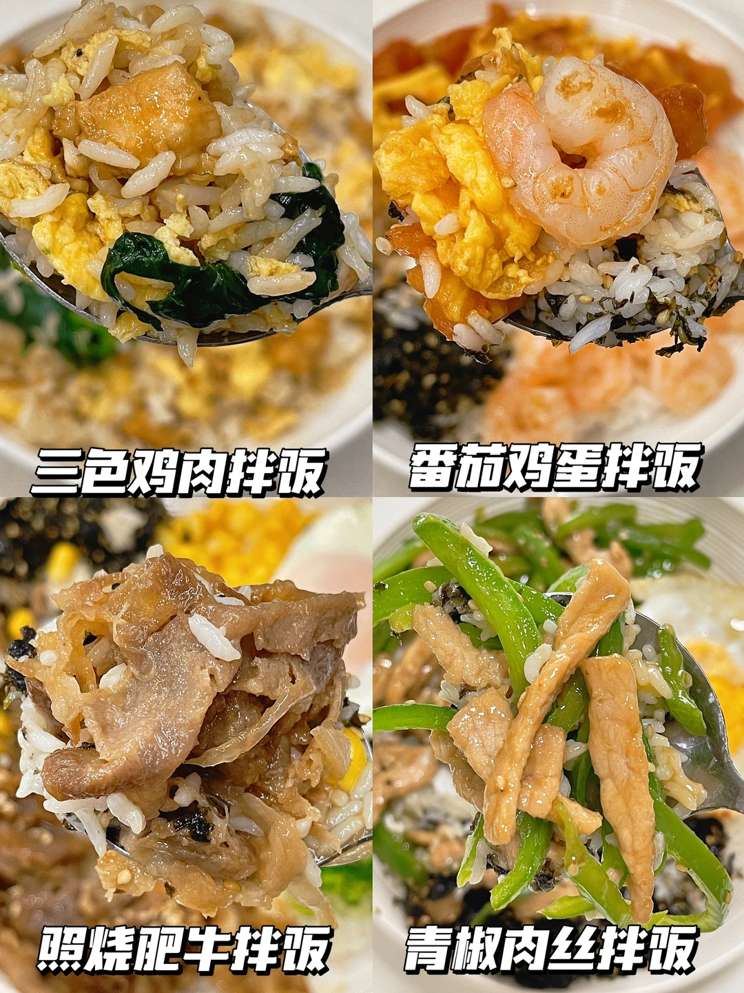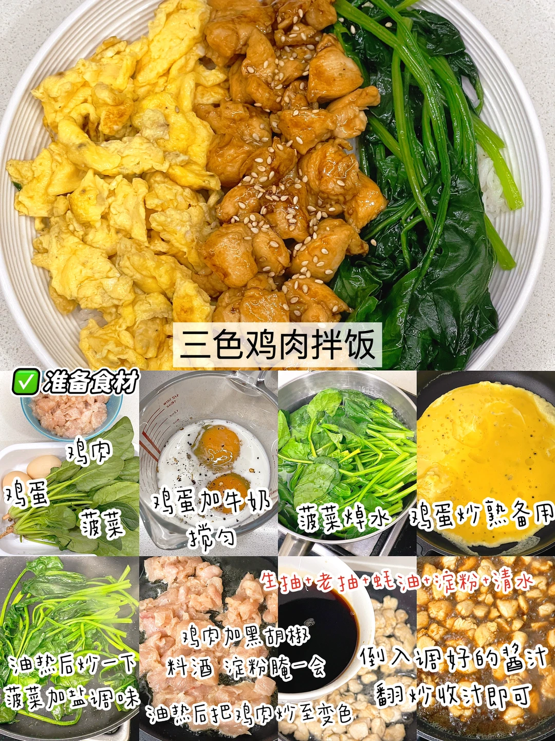 好吃又快手的拌饭一定要去做,一口下去保证爱上! ✅三色鸡肉拌饭 🔹准备食材:鸡胸肉、鸡蛋、菠菜 🔹制作方法:鸡肉切丁,加黑胡椒+料酒+淀粉抓匀腌制一会。鸡蛋+适量牛奶搅匀,炒熟备用。 菠菜焯水捞出,油热放入菠菜翻炒一下加盐调味盛出。另起一锅,油热放入鸡蛋翻炒变色,倒入调好的酱汁(生抽+蚝油+半勺老抽+淀粉+大半碗清水)盖上盖子煮至粘稠即可。 ✅番茄鸡蛋虾仁拌饭 🔹准备食材:番茄、鸡蛋、虾仁、海苔碎 🔹制作方法:鸡蛋炒熟备用。虾仁煎熟。另起一锅,油热倒入番茄炒出汁水,倒入调好的酱汁(生抽+一勺糖+蚝油+半碗清水)最后倒入鸡蛋翻炒均匀即可。 ✅照烧肥牛拌饭 🔹准备食材:肥牛、洋葱、西兰花、鸡蛋、玉米粒、海苔碎 🔹制作方法:玉米、西兰花、肥牛焯水。煎一个鸡蛋备用。 油热先把西兰花炒一下盛出备用。另起一锅油热放入洋葱丝炒出香味,放入肥牛,倒入照烧汁,翻炒粘稠即可。 ✅青椒肉丝拌饭: 🔹准备食材:青椒、猪里脊、鸡蛋、海苔碎 🔹制作方法:鸡蛋煎熟备用,猪理解切丝,放生抽、料酒、淀粉抓匀腌制20分钟。 锅中油热放入肉丝翻炒变色,放入青椒丝翻炒一分钟,倒入调好的酱汁(生抽+蚝油+淀粉+清水)翻炒均匀即可。