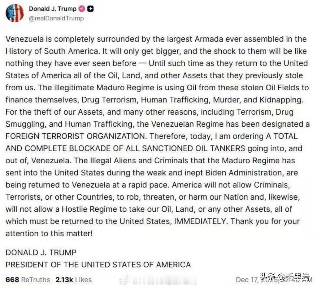 吞并加拿大改成吞并委内瑞拉?老川普肯定是咱们自己人! 过去高明的老中医想杀人,从来不是给人下毒,而是根据目标的情况给他来一剂虚不受补的猛药,直接把人送走…… 最关键的是,任谁还挑不出什么毛病来!!! 老川普现在也是这个套路,他的种种做法看起来都是美国的忠臣良将所为,可实际上…… 这不,就在刚刚他宣布: 委内瑞拉的石油、土地和其他资产是从美国窃取的,不能允许敌对政权拿走,必须立即把石油、土地和任何其他资产全部“还给”美国…… 你说这像是侵略和掠夺吗? 可是这土地呢? 表面上看,委内瑞拉石油大大滴有,把石油都抢回家去炼,然后全球各地卖高价成品油,美国赚钱,还拉动内需能源供应,增加就业,简直好处就不要太多了。 肯定要再仔细想一想,这事情就没那么简单了。 要是吞并个加拿大吧,加拿大本来也没几口人,还都被美国给驯化的,跟农场里的绵羊一样乖,更何况那个地形也没什么乱糟糟的游击战好打。 可是到委内瑞拉恐怕就不是那么回事了。 军事行动上,也许成本并不比武装村民加拿大高,但是吞并之后呢? 这一大堆委内瑞拉人你可怎么办? 让他们自生自灭吗?那么他们肯定要跟你打伊拉克和阿富汗那种治安战…… 那么另一个方案就是只能扶贫了。 加拿大不需要扶贫,他们本来日子过得也很逍遥,可你觉得委内瑞拉呢? 更何况委内瑞拉旁边一大堆拉美国家都是可卡因的高产区…… 所以……