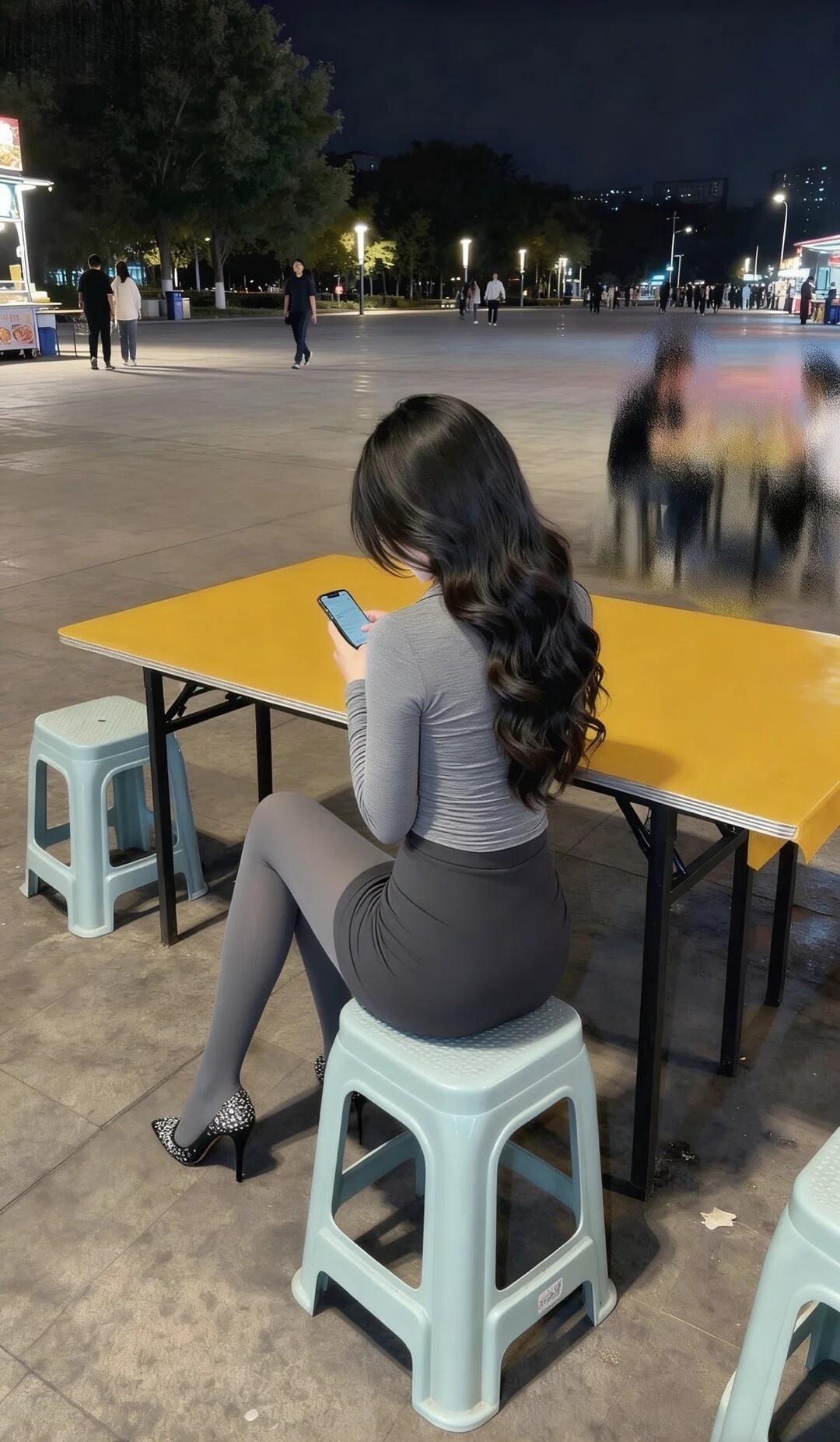 夜晚公园里,独自一人坐在黄色桌旁,手机陪伴,静享宁静时光。