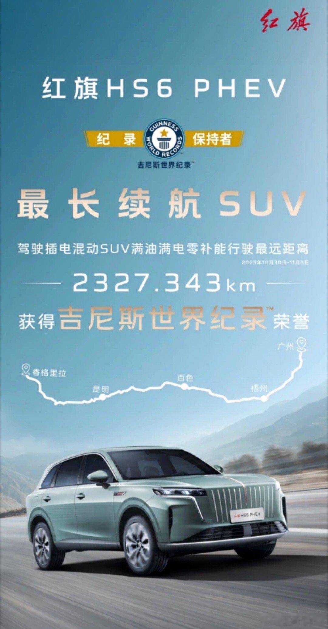 红旗HS6 PHEV上市红旗HS6 PHEV价格17.88万元起,共推出三款车型。新车基于鸿鹄混动平台打造,搭载1.5T插电混动系统,配备23kWh和40kWh磷酸铁锂电池,CLTC纯电续航分别为148km、248km及四驱版的225km。车身尺寸为4925mm×1970mm×1740mm,轴距2925mm。新车标配司南智驾系统,支持高快领航、城市领航与AI代驾功能,并首次采用中控与副驾双连屏设计,搭载高通8295P芯片与灵犀智能座舱。最具有特点的是这款车续航能力。HS6 PHEV 刷新了插电混动 SUV 满电满油零补能行驶最远距离,获得吉尼斯纪录的荣誉,直接跑了2327.343km。其最低馈电油耗仅5.1L/100km。红旗最近动作不少,换标之后估计要进入新一轮发力期。感觉红旗的产品会做一些梳理,必须要上量了,长安和东风最近这么猛,一汽作为老大哥肯定不能掉队。