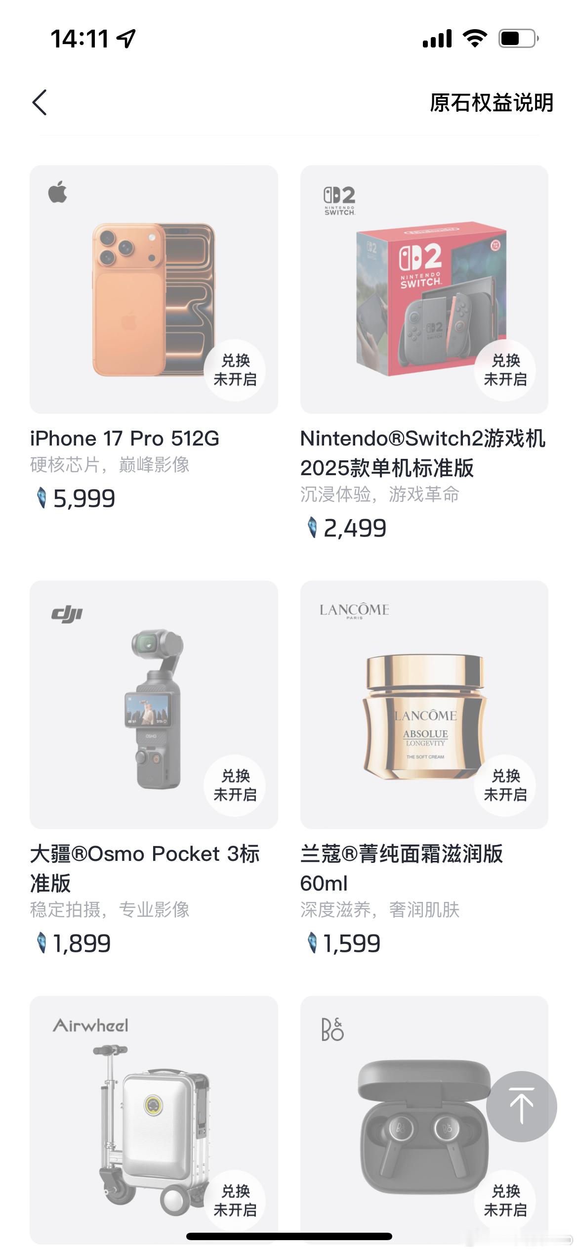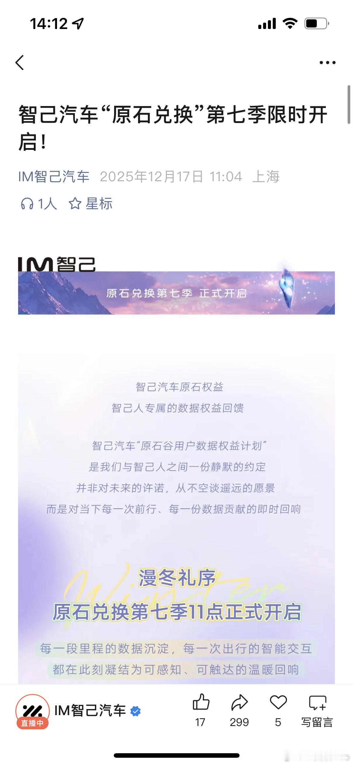 智己汽车“原石兑换”第七季限时开启。智己的原石,简单来说就是加入里程计划。这个和积分不太一样。首先你加入车辆里程计划,用数据(脱敏)换原石,开的越多,获得越多。这是第一家帮助消费者数据变现的车企。这次我看除了可以兑换购车,服务,充电的权益,可兑换的周边里面还有苹果17等。智己汽场全开大v聊车