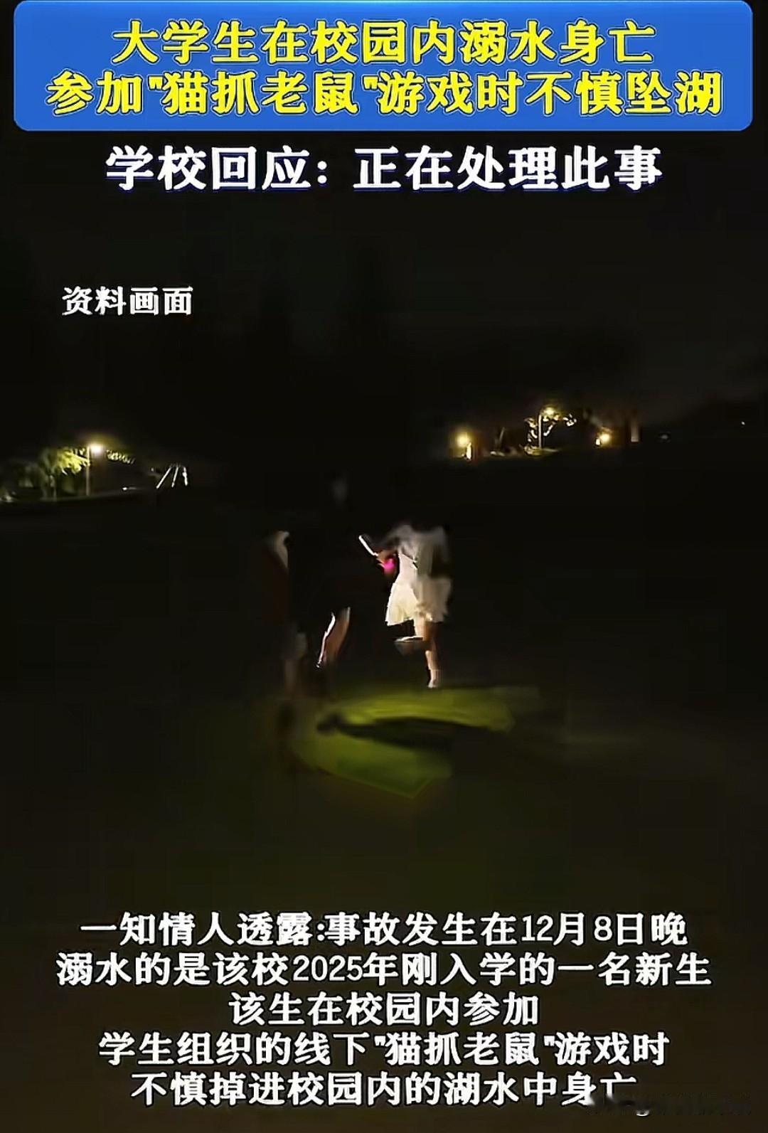 痛心,安徽某大学校内坠湖溺亡的学生,才刚刚步入大学三个月,溺亡前曾和同学们玩“猫捉老鼠”的游戏! 据悉,溺亡学生小菲(化名)来自农村家庭,高考成绩优异,大学正就读计算机专业! 12月8日晚,小菲久久没有回到寝室,室友通过手机发现小菲的定位在校内的风行湖中,通过搜寻发现小菲时她已溺亡在湖中! 其实风行湖的水并不深,只是湖边的部分位置没有安装护栏,且夜晚光线比较暗,不熟悉环境的人存在踩空的风险,如果小菲会游泳应该就可以避免这次危险了,但学校设施确实存在安全隐患! 但事情没有如果,小菲的母亲得知噩耗后脑出血住了院,父亲变得内向不与人沟通交流,好不容易把孩子养大成人,幸苦读书那么多年才考上大学,人生也才刚要开始就发生了意外,实属令人痛心! 希望学校尽快排除校园部分设施的安全隐患,毕竟校园安全问题不容忽视,学生的安全问题永远是第一大事!