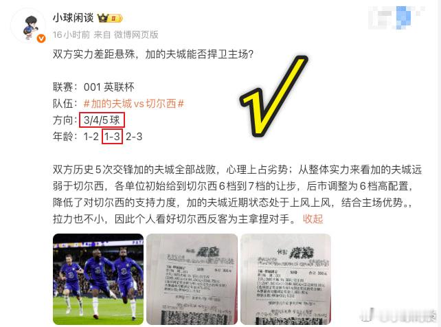 兄弟们!必须跟你们分享这份快乐!昨晚英联杯加的夫城 vs 切尔西那场,居然让我精准命中了!猜中结果的那一刻,我直接拍大腿,这感觉也太爽了!昨天的比赛就一场,本来也就是闲着没事琢磨琢磨比赛,没想到还能拿捏得这么准。现在越看球越觉得,看球的快乐根本不是猜中多少,而是能和你们一起赛前聊阵容、赛后侃球的这份热闹。卡塔尔世界杯没凑齐的遗憾,这届咱们一点点补回来!今晚赛事继续,我已经备好功课,等着和兄弟们一起再冲一波,不见不散!足球英联杯荷兰杯