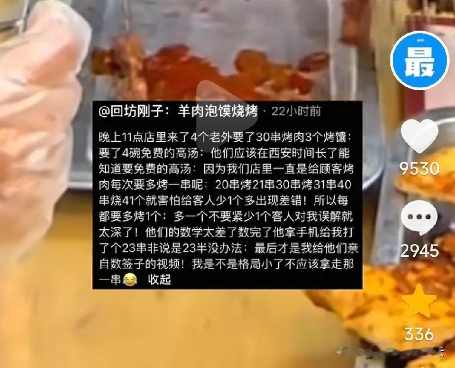 笑喷!西安一家烧烤店,4名印度留学生到店就餐,点了30串烤肉、3个馕,还顺走了4碗免费高汤,结果刚上菜就找老板“找茬”,上演了一出尴尬又好笑的反转戏码。 几人一看到桌上的烤串,立马喊来老板,直言店家给的烤串数量不够,自己点了30串,实际只上了23串,态度笃定像是抓了店家的错处。 可老板心里门儿清,店里有个不成文的规矩:怕烤串数错少给,让顾客吃亏难堪,每次都会主动多烤1串,相当于点30串实际给31串,根本不可能少上。 于是老板胸有成竹地走到留学生桌前,直接打开手机录像,当着4人的面,一根签子一根签子认真数了起来,全程公开透明,数到最后总共31串——不仅没少,还比点单量多1串! 数完后,老板没多废话,直接拿起那串多送的烤肉转身就走,留下4名留学生当场愣住,面面相觑,尴尬到说不出话。 事后老板无奈调侃:看他们还知道要免费高汤,肯定在西安待了不短时间,怎么连基本的数数都不会?难道是自己格局小了,不该把多的那串拿走? 网友们看完纷纷力挺老板:“拿得太对了!多送是情分,找茬就是本分尽失”“本来是好心多给1串,遇到故意找事的,宁愿拿走喂狗也不能惯着”“好心没被珍惜,反而被倒打一耙,换谁都会这么做”。 其实数数本就是全世界通用的基本能力,几十个签子根本不存在数不清的情况,4名留学生大概率是想“浑水摸鱼”,故意找茬占便宜,没想到遇上老板细心又硬气,直接被当场拆穿,偷鸡不成蚀把米,反倒闹了个大笑话。 出门消费讲究的是诚信,店家好心多送是体谅,不是让外人用来钻空子、占便宜的。 不管是本地人还是留学生,都该守好做人的底线,别想着耍小聪明找茬,不然最后只会像这4名留学生一样,尴尬收场还丢了脸面!