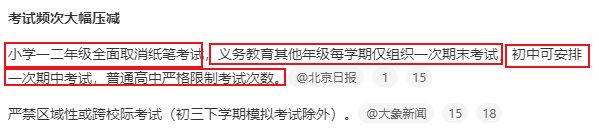 教育部:小学一二年级不进行纸笔考试,高中要严格控制考试次数! 教育部于今日(2025年12月17日)正式发布《加强中小学日常考试管理20条举措》,首次将普通高中纳入考试频次严控范围,明确要求“高中严格控制考试次数”。 非毕业年级严禁组织区域性或跨校际的统一考试,校内考试次数需大幅压缩,毕业年级仅允许在总复习阶段组织1-2次模拟考试,其他考试均被禁止。 小学一、二年级全面取消纸笔考试。义务教育其他年级每学期仅1次期末考试,初中学科需要时可增设1次期中考。 真是给这一代孩子遇上好时候,终于居然应试教育了,不再是为了考试而学习,孩子们终于能挣脱频繁考试的枷锁,把更多精力投入到兴趣探索中。 低年级孩子可以在绘本阅读、手工实践里感受学习的乐趣,不用再为分数焦虑;初高中学生也能告别周测月考的轮番轰炸,沉下心梳理知识体系。 这不仅是为学业减负,更是让教育回归育人本质——不再以一张试卷定优劣,而是让每个孩子都能循着自己的节奏,成长为更鲜活的自己。
