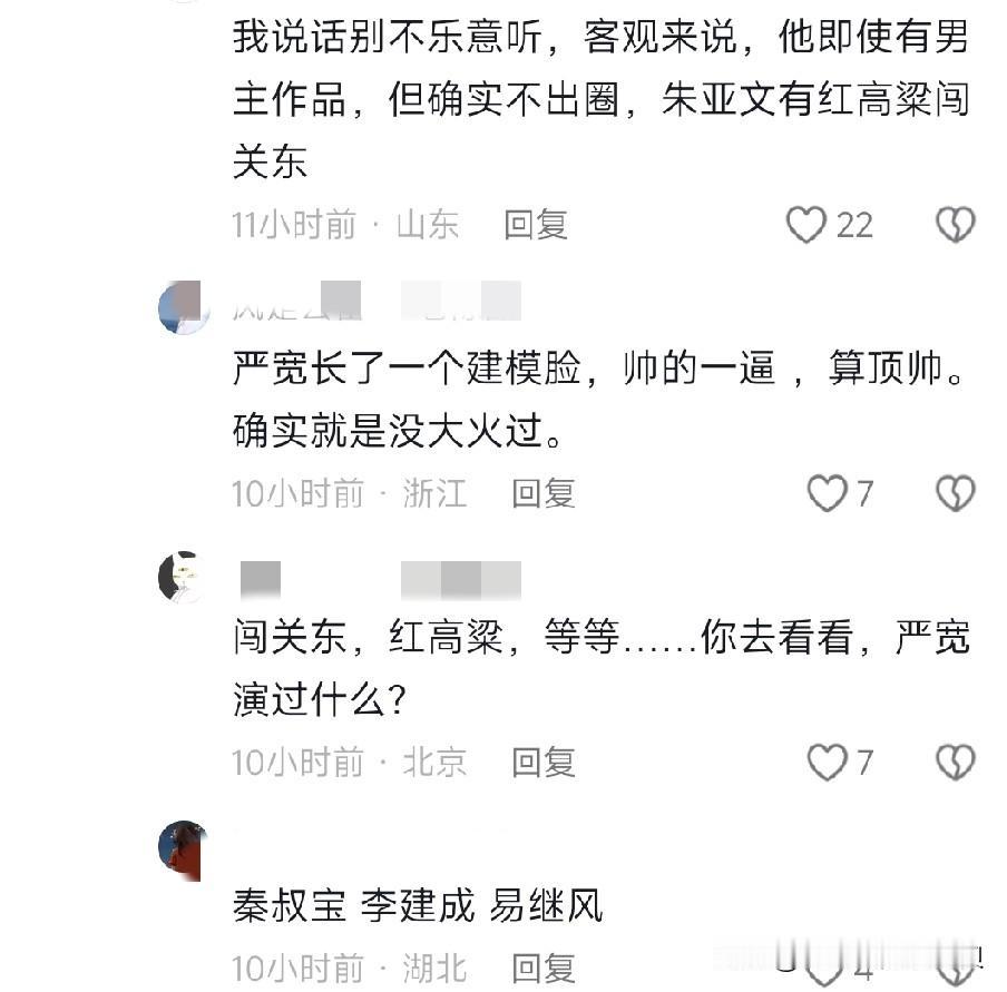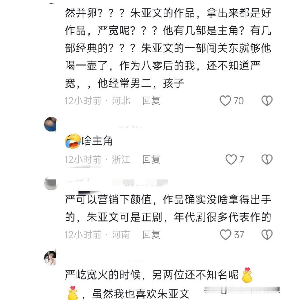 朱亚文和严屹宽因为国剧盛典的同台,引发了网友对他俩的作品讨论。 其实从站位就能看出来,单就作品而言,肯定是朱亚文更胜一筹。 就颜值而言,严宽自然是毫无争议的🔝。 提到朱亚文,你至少能说出他的三个角色, 提到严宽,除了建模脸,真的很难想起来他的作品。 只能说,严宽生错了时代[捂脸] 他那个年代,更看重演员的实力,颜值反倒是其次的。 古偶顶流生张卫健也不是帅哥。[笑哭]