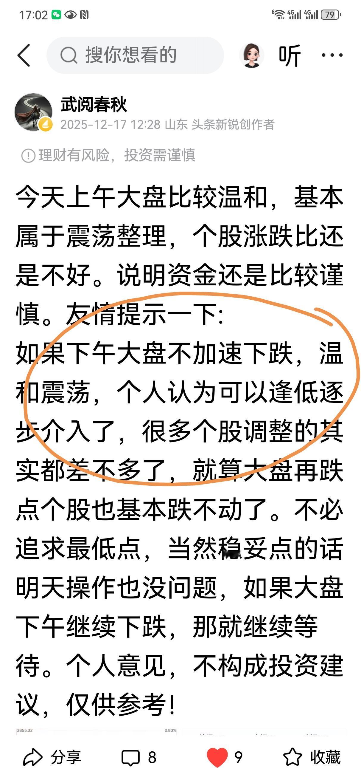 12月18日操盘笔记: 今日大盘走势分析:早盘比较温和,一直震荡整理,个股表现比较弱,绝大多数股票是下跌的,但跌幅都不算大。在上午收盘后,我发帖提示下午如果还是温和震荡那么可以逢低介入了。盘口有迹象显示到了变盘时间,结果下午一点半开始,大盘开启强劲上涨势头,而且一直强势到收盘,提示的时间还是很准确的!前几天也分析过大盘经过二次探底破前低后已经释放了绝大部分空间,即使后面有下跌空间也不大,之所以昨天没提示买入,是因为昨天的跌速太快,通常情况下这种速度会有一定惯性,所以最好的买点应该是在今天或者明天,但是今天的盘面走势明显是不想跌了,那就应该果断出手! 明天操作建议:持股待涨即可!但是前期炒作过的票尽量规避,小心逆势A杀,那些没怎么涨的拿住就好。今天没介入的也没关系,明天找机会买入就行,差不了几个点! 个人意见,仅供参考,祝大家好运!