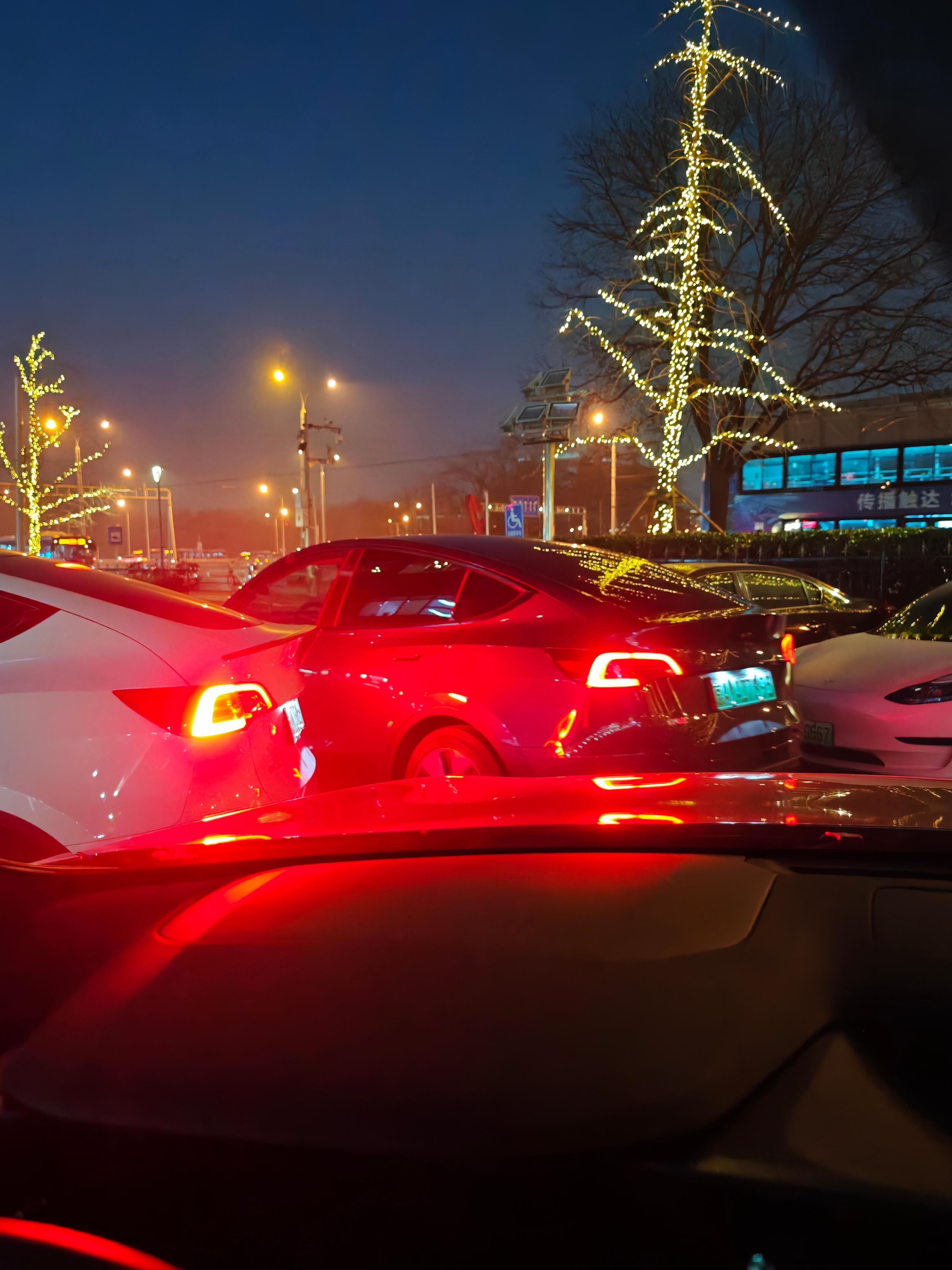 我停好车,一抬头对面四台特斯拉Model Y,两个新款、两个老款左手边两台特斯拉准备排队出停车场,正前方一辆Model 3这密度太夸张了